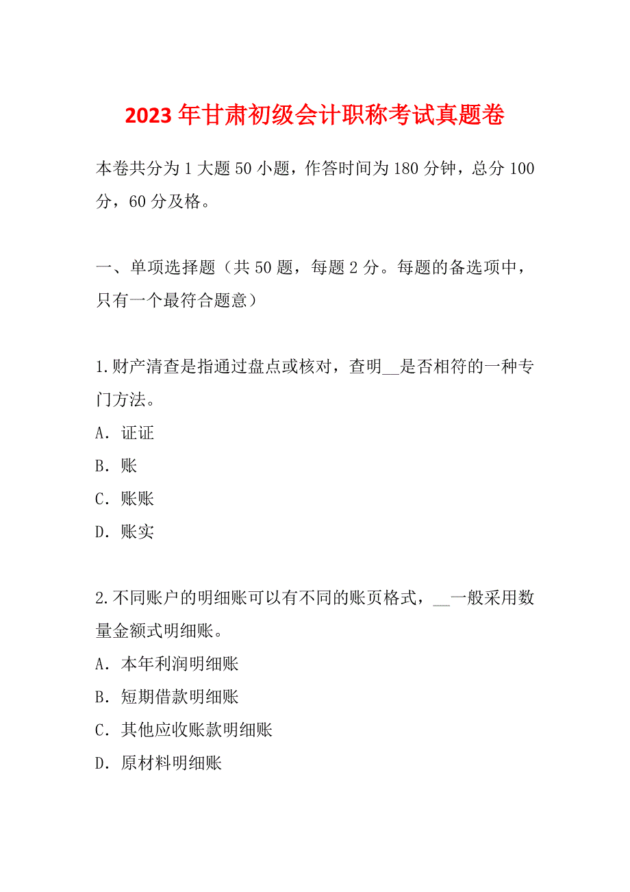 2023年甘肃初级会计职称考试真题卷本卷共分为1大题50小题,作答时间为180分钟,总分100分,60分及格一、单项选择题(共50题,每题2分每题的备选项中,只有一个最符合题意) 1.财产清查是指通过盘点或核对,查明__是否相符的一种专门方法A.证证B.账C.账账D.账实 2.不同账户的明细账可以有不同的账页格式,__一般采用数量金额式明细账A.本年利润明细账B.短期借款明细账C.其他应收账款明细账D.原材料明细账 3.某公司“应收账款”账户所属甲、乙、丙三个明细账户的期末余额分别为900元 (借方)、6 600元(贷方)和9 000元(借方),则“应收账款”总账账户期末余额为__A.3 300(借方)B.6 600(贷方)C.9 000(借方)D.16 500(贷方) 4.不涉及货币收付的经济业务应编制的记账凭证是__A.收款凭证B.付款凭证C.转账凭证D.原始凭证 5.登记会计账簿的直接依据是__A.记账凭证B.原始凭证C.会计要素D.会计等式 6.某企业2009年1月I H所有者权益中实收资本540万元,资本公积60万元,盈余公积43万元,未弥补亏损25万元。
