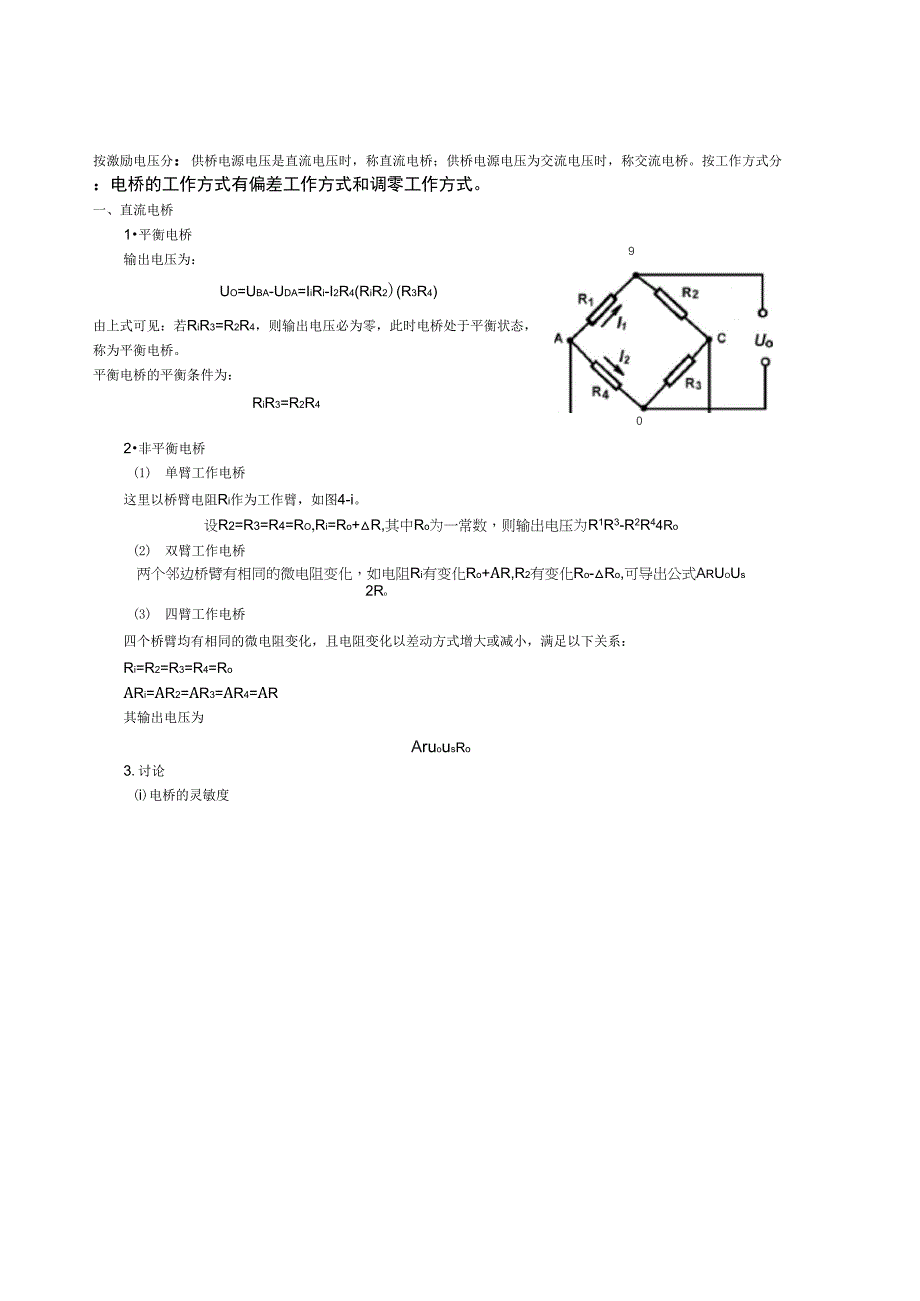 按激励电压分:供桥电源电压是直流电压时,称直流电桥;供桥电源电压为交流电压时,称交流电桥按工作方式分:电桥的工作方式有偏差工作方式和调零工作方式一、直流电桥1•平衡电桥90输出电压为:UO=UBA-UDA=IiRi-I2R4RiR4=UsUsRi:卜R2R3川’R4RiR3-R2R4=US(RiR2)(R3R4)由上式可见:若RiR3=R2R4,则输出电压必为零,此时电桥处于平衡状态,称为平衡电桥图4-i直流电桥平衡电桥的平衡条件为:RiR3=R2R42•非平衡电桥(1) 单臂工作电桥这里以桥臂电阻Ri作为工作臂,如图4-i设R2=R3=R4=Ro,Ri=Ro+△R,其中Ro为一常数,则输出电压为R1R3-R2R4UoUs(Ri+R2)(R3+R4)•:RUs4R02:R若电桥用于微电阻变化测量,有△R远小于Ro,则ARUoUs4Ro(2) 双臂工作电桥两个邻边桥臂有相同的微电阻变化,如电阻Ri有变化Ro+AR,R2有变化Ro-△Ro,可导出公式ArUoUs2Ro(3) 四臂工作电桥四个桥臂均有相同的微电阻变化,且电阻变化以差动方式增大或减小,满足以下关系:Ri=R2=R3=R4=RoARi=AR2=AR3=AR4=AR其输出电压为AruousRo3.讨论(i)电桥的灵敏度在电桥电路中灵敏度定义为U。