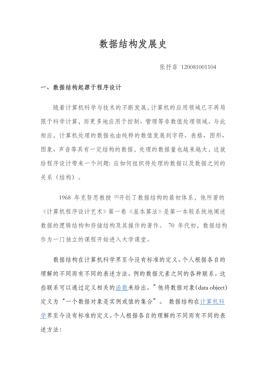 数据结构发展史数据结构发展史张抒菲 120081001104一、数据结构起源于程序设计一、数据结构起源于程序设计随着计算机科学与技术的不断发展,计算机的应用领域已不再局限于科学计算,而更多地应用于控制、管理等非数值处理领域与此相应,计算机处理的数据也由纯粹的数值发展到字符、表格、图形、图象、声音等具有一定结构的数据,处理的数据量也越来越大,这就给程序设计带来一个问题:应如何组织待处理的数据以及数据之间的关系(结构) 1968 年克努思教授 [1]开创了数据结构的最初体系,他所著的《计算机程序设计艺术》第一卷《基本算法》是第一本较系统地阐述数据的逻辑结构和存储结构及其操作的著作 70 年代初,数据结构作为一门独立的课程开始进入大学课堂 数据结构在计算机科学界至今没有标准的定义个人根据各自的理解的不同而有不同的表述方法例的数据元素之间的各种联系这些联系可以通过定义相关的函数来给出他将数据对象(data object)定义为“一个数据对象是实例或值的集合” 数据结构在计算机科学界至今没有标准的定义个人根据各自的理解的不同而有不同的表述方法: Sartaj Sahni 在他的《数据结构、算法与应用》一书中称:“数据结构是数据对象,以及存在于该对象的实例和组成实 Clifford A.Shaffer 在《数据结构与算法分析》一书中的定义是:“数据结构是 ADT(抽象数据类型 Abstract Data Type) 的物理实现。