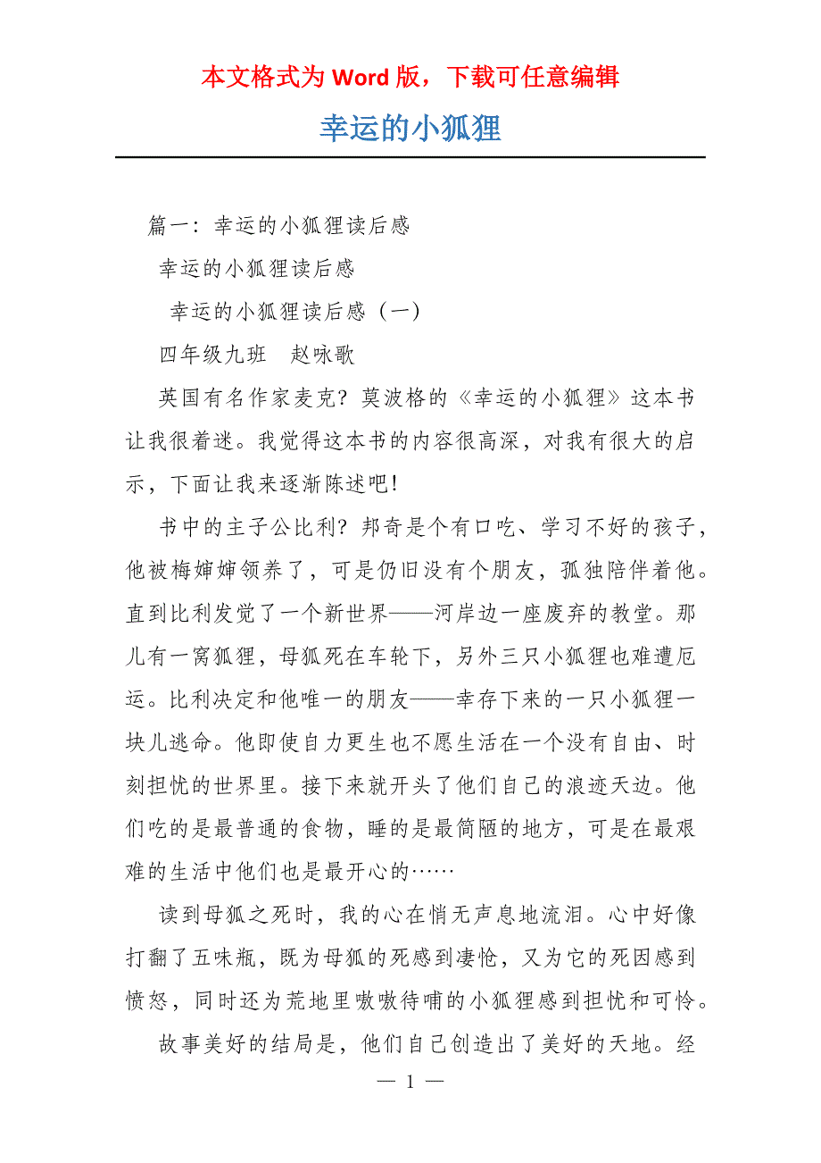 本文格式为Word版,下载可任意编辑幸运的小狐狸 篇一:幸运的小狐狸读后感 幸运的小狐狸读后感 幸运的小狐狸读后感(一) 四年级九班 赵咏歌 英国有名作家麦克?莫波格的《幸运的小狐狸》这本书让我很着迷我觉得这本书的内容很高深,对我有很大的启示,下面让我来逐渐陈述吧! 书中的主子公比利?邦奇是个有口吃、学习不好的孩子,他被梅婶婶领养了,可是仍旧没有个朋友,孤独陪伴着他直到比利发觉了一个新世界——河岸边一座废弃的教堂那儿有一窝狐狸,母狐死在车轮下,另外三只小狐狸也难遭厄运比利决定和他唯一的朋友——幸存下来的一只小狐狸一块儿逃命他即使自力更生也不愿生活在一个没有自由、时刻担忧的世界里接下来就开头了他们自己的浪迹天边他们吃的是最普通的食物,睡的是最简陋的地方,可是在最艰难的生活中他们也是最开心的…… 读到母狐之死时,我的心在悄无声息地流泪心中好像打翻了五味瓶,既为母狐的死感到凄怆,又为它的死因感到愤怒,同时还为荒地里嗷嗷待哺的小狐狸感到担忧和可怜 故事美好的结局是,他们自己创造出了美好的天地经过几番经历,比利留在了一个温馨的家里,小狐狸则回到了树林里,过着开心、平静的生活!比利和小狐狸真大胆! 读完整个故事,我开心地笑了,由于比利和小狐狸自力更生的生活画上了一个圆满的句号,他们找到了属于自己的幸福。