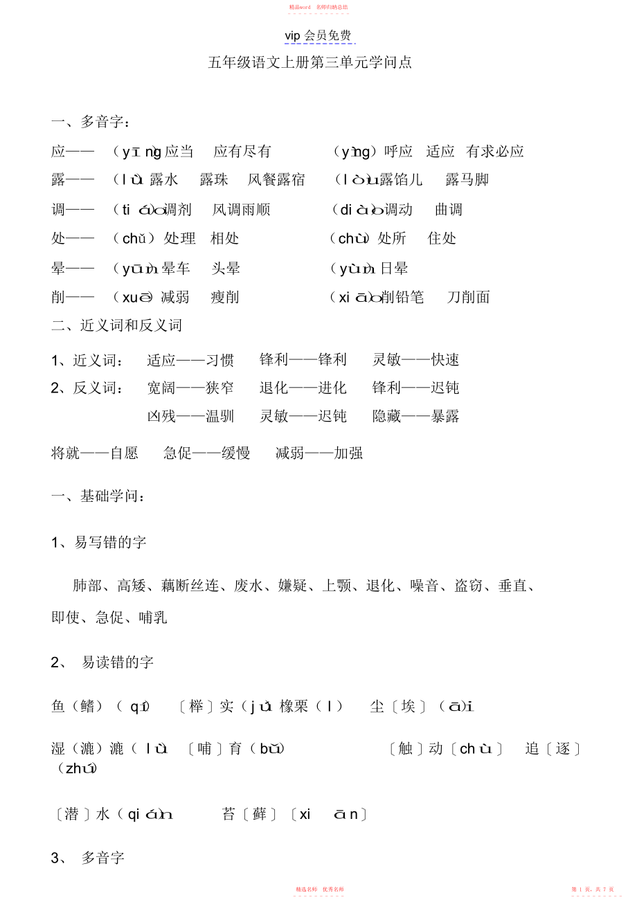 精品word 名师归纳总结 - - - - - - - - - - - -vip 会员免费五年级语文上册第三单元学问点一、多音字:应—— ( yīn)g 应当 应有尽有 (yìng)呼应 适应 有求必应露—— ( l ù)露水 露珠 风餐露宿 ( l ò)u露馅儿 露马脚调—— ( ti á)o调剂 风调雨顺 (di à)o调动 曲调处—— ( chǔ)处理 相处 ( chù)处所 住处晕—— ( yūn)晕车 头晕 ( yùn)日晕削—— ( xuē)减弱 瘦削 ( xi ā)o削铅笔 刀削面二、近义词和反义词1、近义词: 适应——习惯锋利——锋利灵敏——快速2、反义词: 宽阔——狭窄退化——进化锋利——迟钝凶残——温驯灵敏——迟钝隐藏——暴露将就——自愿 急促——缓慢减弱——加强一、基础学问:1、易写错的字肺部、高矮、藕断丝连、废水、嫌疑、上颚、退化、噪音、盗窃、垂直、即使、急促、哺乳2、 易读错的字鱼(鳍)( qí) 〔榉〕实( j ú) 橡栗( l ì) 尘〔埃〕( ā)i湿(漉)漉( l ù) 〔哺〕育( bǔ) 〔触〕动〔ch ù〕 追〔逐〕(zhú)〔潜〕水( qi á)n 苔〔藓〕 〔xi ā n〕3、 多音字精选名师 优秀名师 - - - - - - - - - -第 1 页,共 7 页 - - - - - - - - - -精品word 名师归纳总结 - - - - - - - - - - - -vip 会员免费粘贴( zhān) 看管( kān) 夹丝( ji á) 处理 〔ch ǔ〕 调动( di à)o 划破(huá)减弱( xūe) 朝晖( zhāo)调剂气候中( ti á)o单调( di à)o较短( ji à)o4、 不易懂得的词语:(1)哺乳动物:指高等的脊椎动物,基本特点是靠母体的乳腺分泌乳汁培育诞生幼体;哺乳动物大都是胎生的;(2)妄想:图谋准备;(3) “藕断丝连 ”原是比如表面上似乎已经断了,实际上仍有牵连(4)嫌疑:被怀疑有某种行为的可能性;本课是指被怀疑有盗窃博物馆里的展品的可能性;(5)警报:用电台、汽笛、喇叭等发出的将有危急到来的通知或信号;(6)问世:指作品、产品等与世人见面,本课是指吸热玻璃早就生产出来和用户见面了;(7)噪音:嘈杂、刺耳的声音;(8) “安稳无恙 ”是形容平安,没有受到一点儿损害;(9)分贝:计量声音强度大小的单位,在大、中城市的繁华街道上都有这种计量装置;科学家说,声音超过 54 分贝就称为噪音,对人体有害;5、日积月累(1)常见的说明方法精选名师 优秀名师 - - - - - - - - - -第 2 页,共 7 页 - - - - - - - - - -精品word 名师归纳总结 - - - - - - - - - - - -vip 会员免费(2)《四时之风》这首诗描写了春夏秋冬四个季节风的不同特点,诗句的意思浅显易懂;二、阅读懂得课内精读 课文重点段落懂得 :《鲸》:1、目前已知最大的鲸约有十六万公斤重,最小的也有两千公斤;我国发觉过一头近四万公斤重的鲸, 约十七米长, 一条舌头就有十几头大肥猪那么重; 它要是张开嘴, 人站在它嘴里, 举起手来仍摸不到它的上腭, 四个人围着桌子坐在它的嘴里看书,仍显得很宽阔;这一段落的学问点:说明的方法:A、列数字:作者先列举详细数字来说明鲸的体重,用重量说明鲸大;最大的鲸约有十六万公斤重,最小的也有两千公斤,用这些详细数字说明鲸大;B、 举例子:然后又以我国发觉的一头鲸为例,从它的体重、身长、舌头及口腔的宽大等四方面详细生动地说明鲸的确特别大;C、 作比较:然而,这头鲸虽然有 4 万公斤重,可仍不是最大的,已知的最大的鲸有 16 万公斤重;通过这样比较, 更进一步说明鲸是体态巨大的海洋动物;D、总结:这段话通过运用列数字、举例子、作比较等说明的方法,表达更加精确、 清晰,精选名师 优秀名师 - - - - - - - - - -第 3 页,共 7 页 - - - - - - - - - -精品word 名师归纳总结 - - - - - - - - - - - -vip 会员免费使人对鲸是个庞然大物深信不疑;2、鲸的鼻孔长在脑袋顶上,呼气的时候浮出海面,从鼻孔喷出来的气形成一股水柱,就像花园里的喷泉一样;等肺里吸足了气,再潜入水中;这一段落的学问重点:说明方法:A、打比方这里作者用了一个生动形象的比如,将鲸呼气时喷出来的气比如成 “花园里的喷泉 ”;B、这样写的好处:这种打比方的说明方法,使说明的事物形象详细,给人以深刻的印象;3、在很远的古代,鲸的祖先跟牛羊的祖先一样,生活在陆地上;后来环境发生了变化, 鲸的祖先生活在靠近陆地的浅海里; 又经过了很长很长的岁月, 它们的前肢和尾巴慢慢变成了鳍, 后肢完全退化了, 整个身子成了鱼的样子, 适应了海洋的生活;这一段A、讲授这一段抓住 “陆地 ”——浅“海 ”——海“洋 ”三个词,让同学懂得鲸为了生存下来, 就得适应这个变化的环境, 随着生活环境的转变, 自身体形及器官也发生相应的变化,所以鲸慢慢地变成了鱼的样子;B、这段话主要讲了鲸的进化过程;抓住关键词语 “在很远的古代 ”“很长很长”“慢慢 ”等词语懂得鲸的样子发生了如此巨大的变化; “退化 ”是指动物在进化过程中,某一部分器官逐步变小,构造简化,机能减退甚至完全消逝;这里精选名师 优秀名师 - - - - - - - - - -第 4 页,共 7 页 - - - - - - - - - -精品word 名师归纳总结 - - - - - - - - - - - -vip 会员免费指鲸的后肢在进化过程中逐步变小,最终完全消逝;《新型玻璃》:1、它特别坚硬,受到猛击仍安稳无恙,即使被打碎了,碎片仍旧藕断丝连地粘在一起,不会伤人;学问点:A、“安稳无恙 ”本意:是形容平安,没有受到一点儿损害;本课指夹丝玻璃特别坚硬,受到猛击,仍不会伤人;B、“藕断丝连 ”原是比如表面上似乎已经断了,实际上仍有牵连;本文是指玻璃虽然碎了, 但玻璃片仍粘在一起, 不会四处飞溅伤人; 这两个词语生动而又精确地描述出夹丝玻璃特