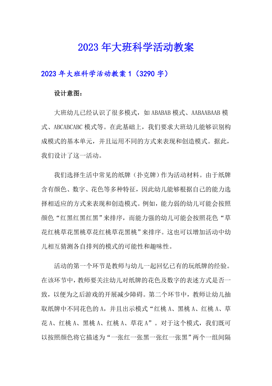 2023年大班科学活动教案 2023年大班科学活动教案1(3290字) 设计意图: 大班幼儿已经认识了很多模式,如ABABAB模式、AABAABAAB模式、ABCABCABC模式等在此基础上,我们要求大班幼儿能够识别构成模式的基本单元,并且运用不同的方式来表现和创造模式据此,我们设计了这一活动 我们选择生活中常见的纸牌(扑克牌)作为活动材料由于纸牌含有颜色、数字、花色等多种特征,因此幼儿能够根据自己的能力选择相适应的方式来表现和创造模式例如,能力弱的幼儿可能会按照颜色“红黑红黑红黑”来排序,而能力强的幼儿可能会按照花色“草花红桃草花黑桃草花红桃草花黑桃”来排序这也可以增加活动中幼儿相互猜测各自排列的模式的可能性和趣味性 活动的第一个环节是教师与幼儿一起回忆已有的玩纸牌的经验在该环节中,教师要关注幼儿对纸牌的花色及数字的表述方式是否一致,以便为之后游戏的开展减少障碍第二个环节中,教师让幼儿抽取纸牌中不同花色的A,并且出示模式“红桃A、黑桃A、红桃A、草花A、红桃A、黑桃A、红桃A、草花A”对于这个模式,我们既可以按照颜色将它描述为“一张红一张黑一张红一张黑”两个一组间隔排列的模式,也可以按照花色将它描述为“一张红桃一张黑桃一张红桃一张草花”四个一组间隔排列的模式。
