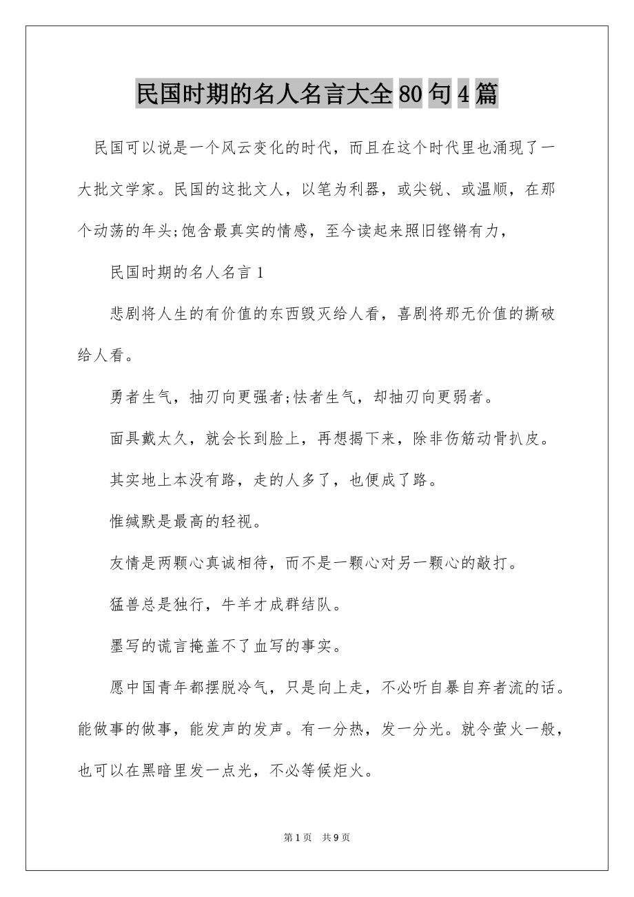 民国时期的名人名言大全80句4篇 民国可以说是一个风云变化的时代,而且在这个时代里也涌现了一大批文学家民国的这批文人,以笔为利器,或尖锐、或温顺,在那个动荡的年头;饱含最真实的情感,至今读起来照旧铿锵有力, 民国时期的名人名言1 悲剧将人生的有价值的东西毁灭给人看,喜剧将那无价值的撕破给人看 勇者生气,抽刃向更强者;怯者生气,却抽刃向更弱者 面具戴太久,就会长到脸上,再想揭下来,除非伤筋动骨扒皮 其实地上本没有路,走的人多了,也便成了路 惟缄默是最高的轻视 友情是两颗心真诚相待,而不是一颗心对另一颗心的敲打 猛兽总是独行,牛羊才成群结队 墨写的谎言掩盖不了血写的事实 愿中国青年都摆脱冷气,只是向上走,不必听自暴自弃者流的话能做事的做事,能发声的发声有一分热,发一分光就令萤火一般,也可以在黑暗里发一点光,不必等候炬火 时间就是性命无端的空耗别人的时间,其实是无异于谋财害命的 哀其不幸,怒其不争 当我缄默的时候,我觉得很充溢,当我开口说话,就感到了空虚 度尽劫波兄弟在,相逢一笑泯恩仇。