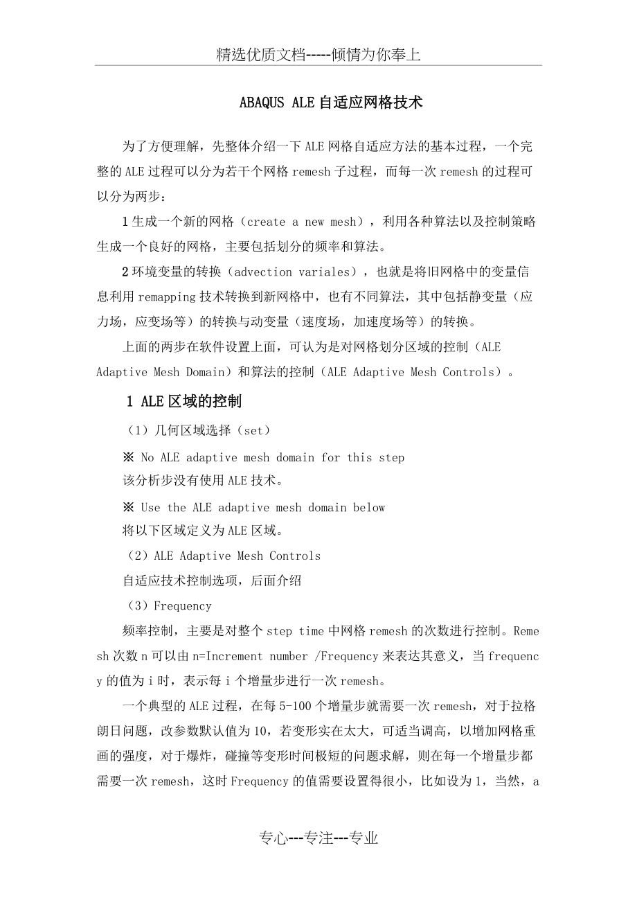 精选优质文档-----倾情为你奉上ABAQUS ALE自适应网格技术为了方便理解,先整体介绍一下ALE网格自适应方法的基本过程,一个完整的ALE过程可以分为若干个网格remesh子过程,而每一次remesh的过程可以分为两步:1生成一个新的网格(create a new mesh),利用各种算法以及控制策略生成一个良好的网格,主要包括划分的频率和算法2环境变量的转换(advection variales),也就是将旧网格中的变量信息利用remapping技术转换到新网格中,也有不同算法,其中包括静变量(应力场,应变场等)的转换与动变量(速度场,加速度场等)的转换上面的两步在软件设置上面,可认为是对网格划分区域的控制(ALE Adaptive Mesh Domain)和算法的控制(ALE Adaptive Mesh Controls)1 ALE区域的控制(1)几何区域选择(set)※ No ALE adaptive mesh domain for this step该分析步没有使用ALE技术※ Use the ALE adaptive mesh domain below将以下区域定义为ALE区域。