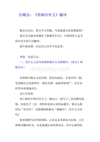 伍耀良:《祭柳员外文》翻译柳宗元死后,祭文不计其数,写得最感人的是哪篇呢?我以为当属刘禹锡的《祭柳员外文》 。可惜网络上迄今没有该文的白话翻译。我不揣浅薄,决定自已动手丰衣足食。译前,先说几点。 一.为什么之前刘禹锡称柳宗元为柳柳州, 《祭文》称柳员外?刘禹锡与柳宗元是同事、朋友加战友,关系非同一般。话说柳宗元死前四年,他们哥俩一起被再贬两广,从长安结伴向南逶迤而行。且行且珍惜。到了衡阳不得不分手了,柳宗元一连写了三首诗赠刘禹锡,刘也回了三首。奇怪的是两人诗的标题中,柳宗元称刘为“刘员外” ,刘禹锡则称柳为“柳柳州” ,有什么不同吗?他哥俩都当员外郎那阵,正是永贞革新如火如荼、人生理想闪耀的时光,也是最遭后来的唐宪宗、宦官记恨的时候。柳宗元这时有意突出“员外郎” ,就是耿耿于怀,不忘那场改革,不忘初心。刘禹锡显然更稳妥一些,他不久前那首长安观桃花诗即惹了祸。虽然柳宗元还未到任,还是称“柳柳州”吧。所以,等到柳宗元死后,刘禹锡才在祭文中称柳宗元最显赫最在意的职务。韩愈、皇甫湜等人写的祭文也称“柳员外” 。他们觉得这是对死者最大的尊重。反正人死为大,谁被刺激了也没辙。何况皇帝老儿唐宪宗跟着也死了,更没辙。唐代员外郎相当于现在某部的副司长(副厅级) ,有人说副司长?才多大的官啊。要知道柳宗元刘禹锡当副司长时才 30 岁出头,而且接近中枢,参与机要,成天在皇帝宰相跟前晃悠,多拉风啊。想想我们在这个年纪时的处境,唉,别提了。二.刘禹锡为柳宗元写了几篇祭文?除《祭柳员外文》外,还有第二、第三篇。写完本篇后几个月,即公元 820 年七月初十,柳宗元归葬故里万年。刘禹锡携带柳宗元大儿子周六前往参加丧礼,又写了《重祭柳员外文》,这是第二篇。内容除应有的哀悼外,主要汇报后事落实情况以及各朋友的热心义举。与第一篇撕心裂肺相比,多了一分理性。第三篇,是刘禹锡替李程(字表臣)写的《为鄂州李大夫祭柳员外文》。这个李程,李氏皇族出身,是一个充满了传奇和争议的人物。在以王叔文为首的革新派和以俱文珍为代表的反对派的斗争中,他与刘禹锡、柳宗元分别站到了两个阵营当中。然而,出乎世人意料之外的是,李程和柳、刘之间仍然保留着一份难得的友谊。有专家臆测李程怀有对柳、刘的一丝歉意。我说不大可能。整革新派的是保守派、宦官集团,唐宪宗最后拿主意。永贞革新失败时,李程在四川混军饷,元和十年柳宗元再贬柳州,李程还只是个兵部郎中。就算想说什么,也没人听。政见有异很正常,韩愈不也是对革新派不满吗?君子之交的最高境界是和而不同。所以,当柳宗元在柳州病逝之后,灵柩北归途经武昌,时任鄂岳观察使的李程,专门委托刘禹锡代作祭文,聊寄哀思。据此推断,刘禹锡这篇替人写的祭文,写于公元 820 年正月 —7 月间。按时间顺序,当在《重祭柳员外文》之前。或问,李程本人好歹也是进士,有文化的,自已不会写啊?须知李程这人生性疏懒、滑稽好玩,不愿动笔。索性以工作忙为由,让刘代笔。古代请人代写文章蔚为风气,算不了什么。代笔者心安理得注上姓名,委托者也没意见,也许还得送上润笔费。但现代一些官员的文章报告讲稿,多由秘书代笔,却只署领导姓名,秘书成了幕后英雄,呵呵。三.《祭柳员外文》是伟大友谊的绝唱刘禹锡《祭柳员外文》,情真意切,一哭三叹。后人无不为它的大河般的感情激流所震撼。它之所以传诵后世,得益于刘禹锡的两个“深厚”:深厚的感情基础,深厚的文字功底。没有感情,如同农村老太太的有偿哭丧,哭了半天,不知死的是谁;没有文才,写的祭文味同嚼蜡,连自已都感动不了。“二十年来万事同”的柳、刘,生死之交,情同兄弟。按现在说法,是铁哥们,过命的朋友。如今一个先走了,另一个写祭文祭奠他。刘禹锡怎么写的呢?一是真实。祭文系肺腑之言,写得情真意切,抒发了生死相助、肝胆相照的情怀。作者如实地倾诉失去知已的极度哀痛,兄弟情、战友谊浸透在无尽的泪水里。突闻噩耗,刘禹锡他“惊号大哭,如得狂病。良久问故,百哀攻中。涕洟迸落,魂魄震越。伸纸穷竟,得君遗书。绝弦之音,凄惨彻骨。”沉重的打击,比死了他老娘还过之。无奈斯人已去,刘禹锡只有早晚向南遥拜老友魂灵:“朝晡临后,出就别次。南望桂水,哭我故人。孰云宿草,此恸何极!”还是做些实事好事吧。刘禹锡向天发誓:“誓使周六,同于己子”。二是细节。例如衡阳之约。祭文中写道:刘禹锡母亲病故,柳宗元多次派人去连州吊唁,并相约刘扶柩到衡阳时,柳宗元一定赶来慰问。而当刘禹锡扶柩真的到了衡阳、翘首以待时,盼来的却是柳的噩耗。(“期以中路,更申愿言。途次衡阳,云有柳使。谓复前约,忽承讣书。”)前约犹在,伊人已逝。阴阳相隔,痛何如哉!又如请写墓志铭。祭文写道:刘禹锡素来身体欠佳,恐先殁于柳宗元,曾约请柳宗元为自已写墓志铭。谁知好友竟先他而去!(顾余负衅,营奉方重。犹冀前路,望君铭旌。)只有两人才知道的小秘密,于今让生者向死者幽幽诉说。细节的力量无穷,四两拨千斤。它使文章更丰满、生动。三是语言。朴实自然的语言,更衬托了作者与柳宗元友谊的纯洁。几处疑问句,仿佛老友并未死去,生者还在向死者问话。阴阳间两个心灵的对话,凄恻徘徊,令人心酸。反问句、排比句的