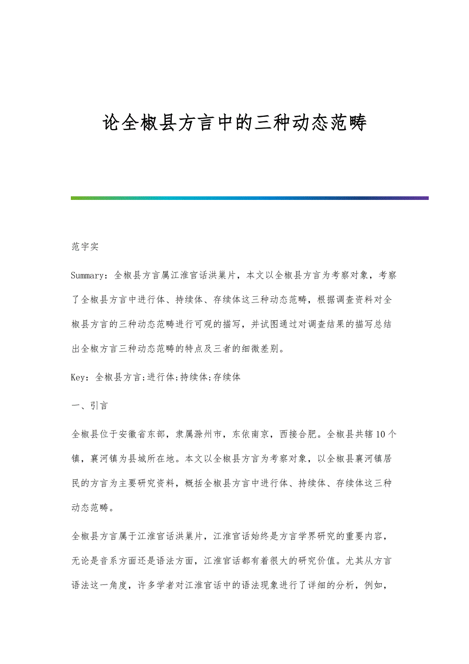 论全椒县方言中的三种动态范畴 范宇实Summary:全椒县方言属江淮官话洪巢片,本文以全椒县方言为考察对象,考察了全椒县方言中进行体、持续体、存续体这三种动态范畴,根据调查资料对全椒县方言的三种动态范畴进行可观的描写,并试图通过对调查结果的描写总结出全椒方言三种动态范畴的特点及三者的细微差别Key:全椒县方言;进行体;持续体;存续体一、引言全椒县位于安徽省东部,隶属滁州市,东依南京,西接合肥全椒县共辖10个镇,襄河镇为县城所在地本文以全椒县方言为考察对象,以全椒县襄河镇居民的方言为主要研究资料,概括全椒县方言中进行体、持续体、存续体这三种动态范畴全椒县方言属于江淮官话洪巢片,江淮官话始终是方言学界研究的重要内容,无论是音系方面还是语法方面,江淮官话都有着很大的研究价值尤其从方言语法这一角度,许多学者对江淮官话中的语法现象进行了详细的分析,例如,江淮方言中对于进行体、持续体、存续体的表达方式有很多相似之处,但不同的方言又有着自身的特点(王健,2006)因此,本文将参考学者们对江淮方言三种动态范畴的研究成果,分析调查全椒方言三种动态范畴的不同表现二、三种动态范畴进行体、持续体、存续体是汉语方言中十分常见的三种动态范畴,这三种动态范畴虽然常见,但是学者们对这三种动态范畴的区分却有着不同的意见。