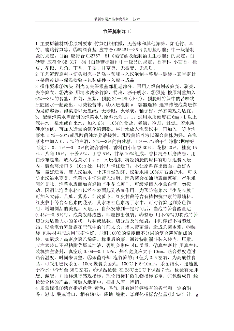 最新农副产品和食品加工技术竹笋腌制加工1 主要原辅材料①原料要求 竹笋组织柔嫩,无苦味和其他异味如毛竹、早竹、哺鸡竹笋等②辅料食盐 应符合 5《食用盐标准》中一级精制盐的规定白酒 应符合 1《蒸馏酒及配制酒卫生标准》的规定白砂糖 应符合 17—84《白砂糖标准》中一级品的规定香辛料 小茴香、桂皮、花椒、八角、丁香、干姜、甘草等,无霉变,无杂质 2 工艺流程原料→切头剥壳→洗涤→预腌→入坛泡制→整形→装袋→真空密封→杀菌冷却→保温检验→包装成件→入库→成品 3 操作要求①切头 剥壳切去笋根基部粗老部分,再用刀纵向划破笋壳,剥壳,去净笋衣②洗涤 用清水洗涤竹笋,捞出,沥干明水③预腌 按原料重加入6%—8%的食盐,拌匀,压紧,预腌 24—48h(小时)预腌时竹笋中的苦味物质随囟水一起流出,可减轻苦味④入坛泡制 a.容器选择 选择传统泡菜坛作为发酵容器泡菜坛以无裂纹,无砂眼,火候老,釉子好,形态美观为适宜b.配制泡菜水需配制的泡菜水与原料比为 1:1选用水质硬度在 6 以上深井水、泉水或自来水,加入 6%—10%的食盐,煮沸,冷却,过滤若水质硬度较低,可加入适量的氯化钙调整将盐水放入泡菜坛中,再加入一等老泡菜水 15%—20%或乳酸菌纯培养液接种。