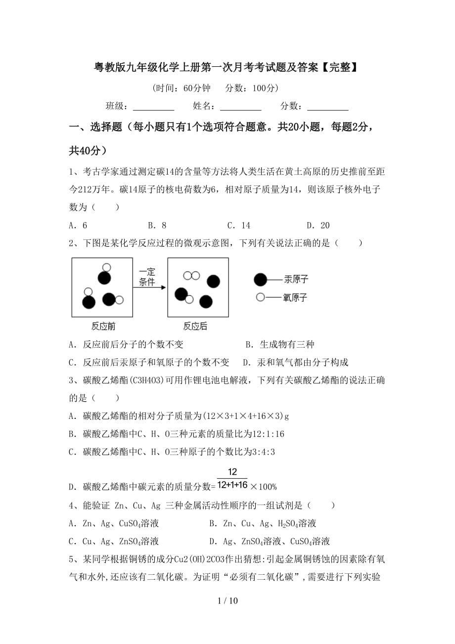粤教版九年级化学上册第一次月考考试题及答案【完整】(时间:60分钟 分数:100分) 班级: 姓名: 分数: 一、选择题(每小题只有1个选项符合题意共20小题,每题2分,共40分)1、考古学家通过测定碳14的含量等方法将人类生活在黄土高原的历史推前至距今212万年碳14原子的核电荷数为6,相对原子质量为14,则该原子核外电子数为( )A.6 B.8 C.14 D.202、下图是某化学反应过程的微观示意图,下列有关说法正确的是( )A.反应前后分子的个数不变 B.生成物有三种C.反应前后汞原子和氧原子的个数不变 D.汞和氧气都由分子构成3、碳酸乙烯酯(C3H4O3)可用作锂电池电解液,下列有关碳酸乙烯酯的说法正确的是( )A.碳酸乙烯酯的相对分子质量为(123+14+163)gB.碳酸乙烯酯中C、H、O三种元素的质量比为12:1:16C.碳酸乙烯酯中C、H、O三种原子的个数比为3:4:3D.碳酸乙烯酯中碳元素的质量分数=100%4、能验证 Zn、Cu、Ag 三种金属活动性顺序的一组试剂是( )A.Zn、Ag、CuSO4溶液 B.Zn、Cu、Ag、H2SO4溶液C.Cu、Ag、ZnSO4溶液 D.Ag、ZnSO4溶液、CuSO4溶液5、某同学根据铜锈的成分Cu2(OH)2CO3作出猜想:引起金属铜锈蚀的因素除有氧气和水外,还应该有二氧化碳。