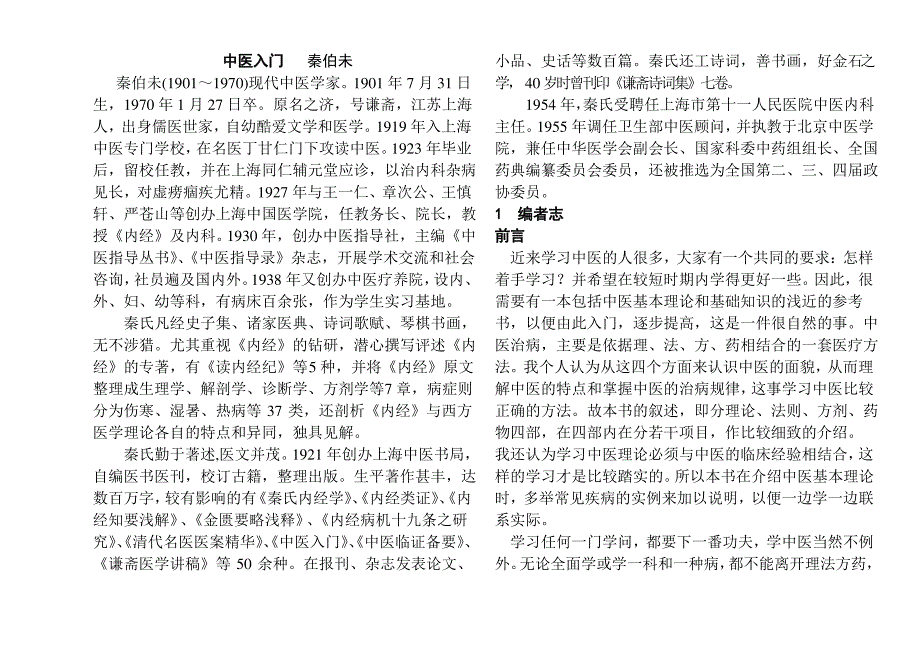 在报刊、杂志发表论文、小品、史话等数百篇秦氏还工诗词,善书画,好金石之学, 40岁时曾刊印谦斋诗词集七卷1954 年, 秦氏受聘任上海市第十一人民医院中医内科主任 1955 年调任卫生部中医顾问, 并执教于北京中医学院,兼任副会长、国家科委中药组组长、全国药典编纂委员会委员,还被推选为全国第二、三、四届政协委员1 1编者志编者志前言前言近来学习中医的人很多,大家有一个共同的要求:怎样着手学习?并希望在较短时期内学得更好一些因此,很需要有一本包括中医基本理论和基础知识的浅近的参考书,以便由此入门,逐步提高,这是一件很自然的事中医治病,主要是依据理、法、方、药相结合的一套医疗方法我个人认为从这四个方面来认识中医的面貌,从而理解中医的特点和掌握中医的治病规律, 这事学习中医比较正确的方法故本书的叙述,即分理论、法则、方剂、药物四部,在四部内在分若干项目,作比较细致的介绍我还认为学习中医理论必须与中医的临床经验相结合, 这样的学习才是比较踏实的 所以本书在介绍中医基本理论时,多举常见疾病的实例来加以说明,以便一边学一边联系实际学习任何一门学问,都要下一番功夫,学中医当然不例外 无论全面学或学一科和一种病, 都不能离开理法方药,但是不必看得太难, 也不可估计得太简单, 只要循序渐近,由入门而提高,是不难学会的。