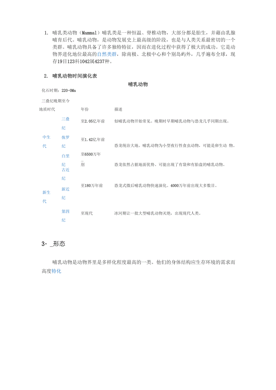 1. 哺乳类动物(Mammal)哺乳类是一种恒温、脊椎动物,大部分都是胎生,并藉由乳腺 哺育后代哺乳动物,是动物发展史上最高级的阶段,也是与人类关系最密切的一个 类群哺乳动物具备了许多独特特征,因而在进化过程中获得了极大的成功它是动 物界进化地位最高的自然类群,除南极、北极中心和个别岛屿外,几乎遍布全球,现 存19目123科1042属4237种2. 哺乳动物时间演化表哺乳动物化石时期:220-0Ma三叠纪晚期至今地质时代年份描述三叠纪至2.05亿年前似哺乳动物开始常见晚期时早期哺乳动物与恐龙几乎同期出现中生代侏罗纪至1.42亿年前恐龙统治大地哺乳动物为小型夜行性食虫动物,可能是卵生动 物白垩纪至6500万年_J_Z_刖恐龙依然占据地面优势可能出现了有袋和有胎盘的哺乳动物新生代古近纪新近纪至180万年前恐龙式微后哺乳动物快速演化4000万年前出现大多数目第四纪至现代冰河期让一批大型哺乳动物灭绝,出现现代人类3・_形态哺乳动物是动物界里是多样化程度最高的一类他们的身体结构应生存环境的需求而高度特化最大的哺乳动物蓝鲸的体重(150吨)差不多是最小的凹脸蝠(2克)的7000万倍 他们的外形也是千奇百怪。