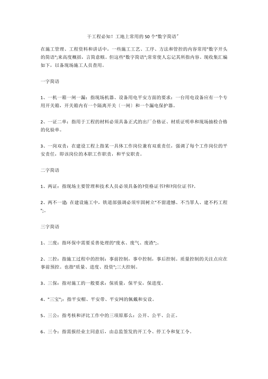 干工程必知!工地上常用的50个“数字简语〞 在施工管理、工程资料和讲话中,一些施工工艺、工序、方法和管控的内容常用"数字开头的简语";来高度概括,言简意赅但这些"数字简语";常常使人忘记其所指内容现收集汇编如下,以备现场施工人员查用一字简语1、一机一箱一闸一漏:指现场机器、设备用电平安方面的要求:一台用电设备应有一个专用开关箱,开关箱内有一个隔离开关〔一闸〕和一个漏电保护器2、一证二单:指用于工程的材料必须具备正式的出厂合格证、材质证明单和现场抽检合格的化验单3、一岗双责:在建设工程上指某一具体工作岗位兼有双重责任,强调了每个工作岗位的平安责任,即该岗位的本职工作职责,和平安职责二字简语1、两证:指现场主要管理和技术人员必须具备的?资格证书?和?岗位证书?2、两不一建:在建设施工中,铁道部强调必须牢固树立"不留遗憾、不当罪人、建不朽工程";三字简语1、三废:指环保中需要妥善处理的"废水、废气、废渣";2、三控:指施工过程中的控制:事前控制,事中控制,事后控制质量控制的关注点应在事前预控也指"质量、进度、投资";三大控制3、三保:指对施工的一般要求:保质量,保平安,保进度4、"三宝";:指平安帽、平安带、平安网的佩戴和安设。