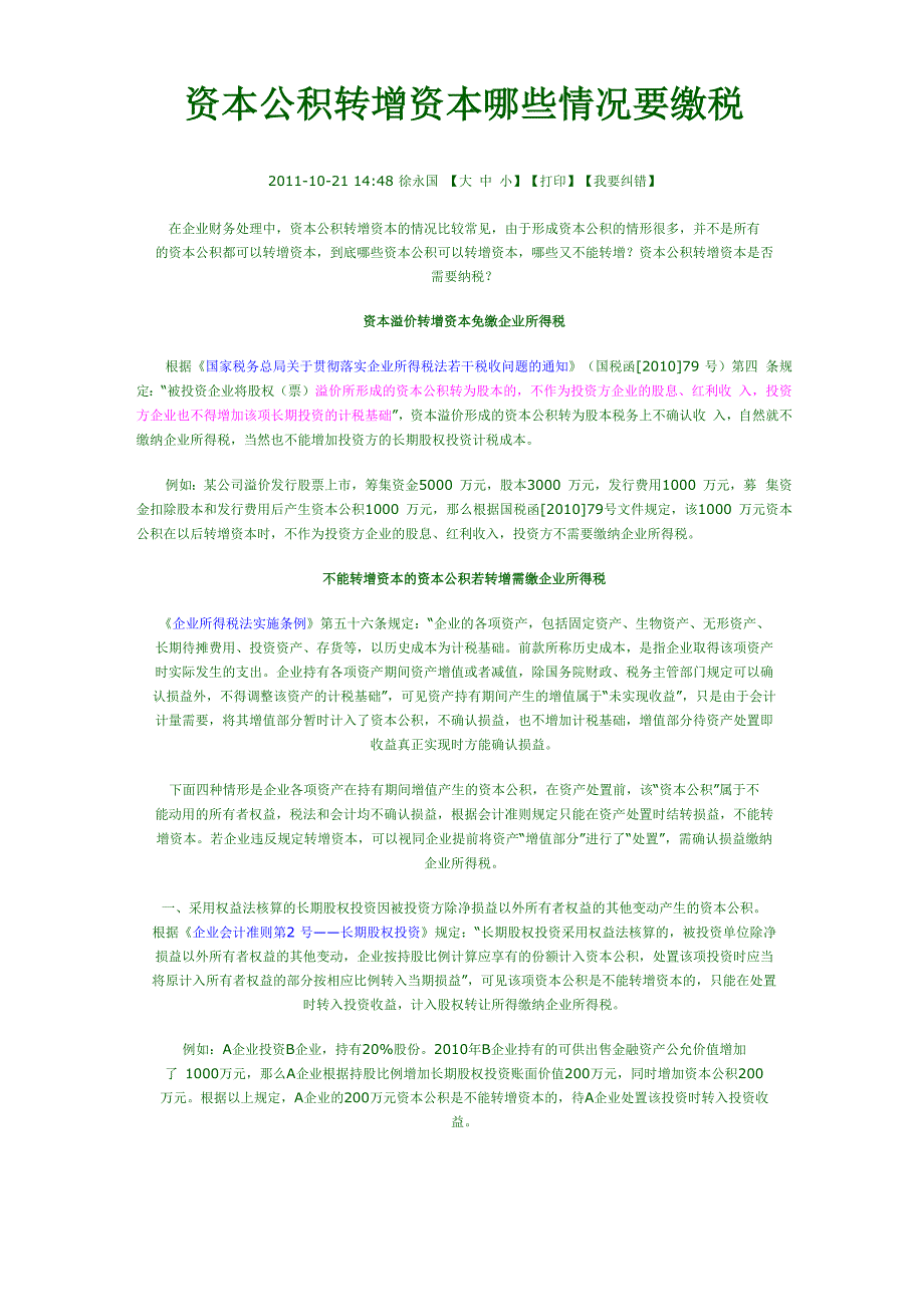 资本公积转增资本哪些情况要缴税2011-10-21 14:48 徐永国 【大 中 小】【打印】【我要纠错】在企业财务处理中,资本公积转增资本的情况比较常见,由于形成资本公积的情形很多,并不是所有的资本公积都可以转增资本,到底哪些资本公积可以转增资本,哪些又不能转增?资本公积转增资本是否需要纳税?资本溢价转增资本免缴企业所得税根据《国家税务总局关于贯彻落实企业所得税法若干税收问题的通知》(国税函[2010]79 号)第四 条规定:“被投资企业将股权(票)溢价所形成的资本公积转为股本的,不作为投资方企业的股息、红利收 入,投资方企业也不得增加该项长期投资的计税基础”,资本溢价形成的资本公积转为股本税务上不确认收 入,自然就不缴纳企业所得税,当然也不能增加投资方的长期股权投资计税成本例如:某公司溢价发行股票上市,筹集资金5000 万元,股本3000 万元,发行费用1000 万元,募 集资金扣除股本和发行费用后产生资本公积1000 万元,那么根据国税函[2010]79号文件规定,该1000 万元资本公积在以后转增资本时,不作为投资方企业的股息、红利收入,投资方不需要缴纳企业所得税不能转增资本的资本公积若转增需缴企业所得税《企业所得税法实施条例》第五十六条规定:“企业的各项资产,包括固定资产、生物资产、无形资产、长期待摊费用、投资资产、存货等,以历史成本为计税基础。