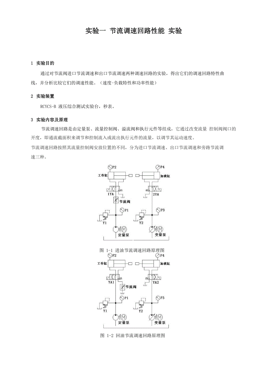 实验一 节流调速回路性能 实验1 实验目的通过对节流阀进口节流调速和出口节流调速两种调速回路的实验,得出它们的调速回路特性曲线,并分析比较它们的调速性能速度-负载特性和功率性能)2 实验装置RCYCS-B 液压综合测试实验台,秒表3 实验内容及原理节流调速回路是由定量泵、流量控制阀、溢流阀和执行元件等组成,它通过改变流量 控制阀阀口的开度,即通流截面积来调节和控制流入或流出执行元件的流量,以调节其运动速度节流调速回路按照其流量控制阀安放位置的不同,分为进口节流调速、出口节流调速和旁路节流调速三种图 1-1 进油节流调速回路原理图图 1-2 回油节流调速回路原理图在加载回路中,当压力油进入加载液压缸右腔时,由于加载液压缸活塞杆与调速回路工作液压 缸的活塞杆将处于同心位置直接对顶,而且它们的缸筒都固定在工作台上,因此工作液压缸的活塞 杆受到一个向左的作用力(负载Fl),调节溢流阀II可以改变Fl的大小在调速回路中,工作液压缸的活塞杆的工作速度V与节流阀的通流面积a、溢流阀调定压力P] (定量泵供油压力)及负载Fl有关而在一次工作过程中,a和P1都预先调定不再变化,此时活塞 杆运动速度v只与负载Fl有关。
