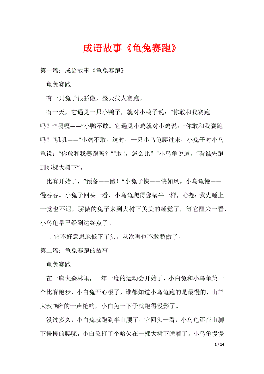 成语故事《龟兔赛跑》第一篇:成语故事《龟兔赛跑》 龟兔赛跑 有一只兔子很骄傲,整天找人赛跑 有一天,它遇见一只小鸭子,就对小鸭子说:“你敢和我赛跑吗?”“嘎嘎——”小鸭不敢它遇见小鸡就对小鸡说:“你敢和我赛跑吗?“叽叽——”小鸡不敢这时,一只小乌龟爬过来,小兔子对小乌龟说:“你敢和我赛跑吗?”“敢!,怎么比?”小乌龟说道,“看谁先跑到那棵大树下” 比赛开始了,“预备——跑!”小兔子快——快如风小乌龟慢——慢吞吞小兔子回头一看,小乌龟爬得像蜗牛一样,心想:我先睡上一觉也不迟,骄傲的兔子来到大树下美美的睡觉了,等它醒来一看,小乌龟早已经到达终点了 . 它不好意思地低下了头,从次再也不敢骄傲了 第二篇:龟兔赛跑的故事 龟兔赛跑 在一座大森林里,一年一度的运动会开始了,小白兔和小乌龟第一个比赛跑步,小白兔开心极了,谁都知道小乌龟跑的是最慢的,山羊大叔“嘭”的一声枪响,小白兔一下子就跑得没影了 没过多久,小白兔就跑到半山腰了,它回头一看,小乌龟还在山脚下慢慢的爬呢,小白兔打了个哈欠在一棵大树下睡着了小乌龟慢慢地爬呀爬,爬呀爬,终于爬到了半山腰,它看到小白兔睡在大树下,说:“喂,小白兔,我们还在比赛呢,你怎么睡着了?”小白兔说:“别吵我,我睡得正香呢!” 过了很长时间,山羊大叔看到第一个到达终点的是小乌龟。