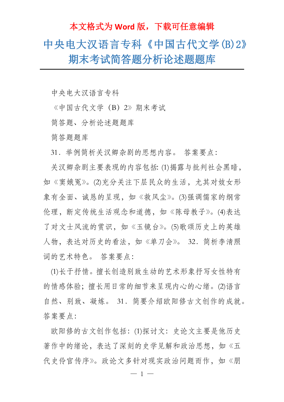 本文格式为Word版,下载可任意编辑中央电大汉语言专科《中国古代文学(B)2》期末考试简答题分析论述题题库 中央电大汉语言专科 《中国古代文学(B)2》期末考试 简答题、分析论述题题库 简答题题库 31.举例简析关汉卿杂剧的思想内容 答案要点: 关汉卿杂剧主要表现的内容包括:(1)揭露与批判社会黑暗,如《窦娥冤》2)充分关注下层民众的生活,尤其对妓女形象有全面、诚恳的呈现,如《救风尘》3)强调儒家的纲常伦理,断定传统生活观念和道德,如《陈母教子》4)表达了对文士风流的赏识,如《玉镜台》5)歌颂历史上的英雄人物,表达对历史的看法,如《单刀会》 32.简析李清照词的艺术特色 答案要点: (1)长于抒情擅长创造别致生动的艺术形象抒写女性特有的情感体验;擅长用日常的细节来呈现内心的心绪2)语言自然、别致、凝炼 31.简要介绍欧阳修古文创作的成就 答案要点: 欧阳修的古文创作包括:(1)探讨文:史论文主要是他历史著作中的绪论,表达了深刻的史学见解和政治思想,如《五代史伶官传序》政论文多针对现实政治问题而作,如《朋党论》2)记叙文:平易畅达,富于感情,如《醉翁亭记》。