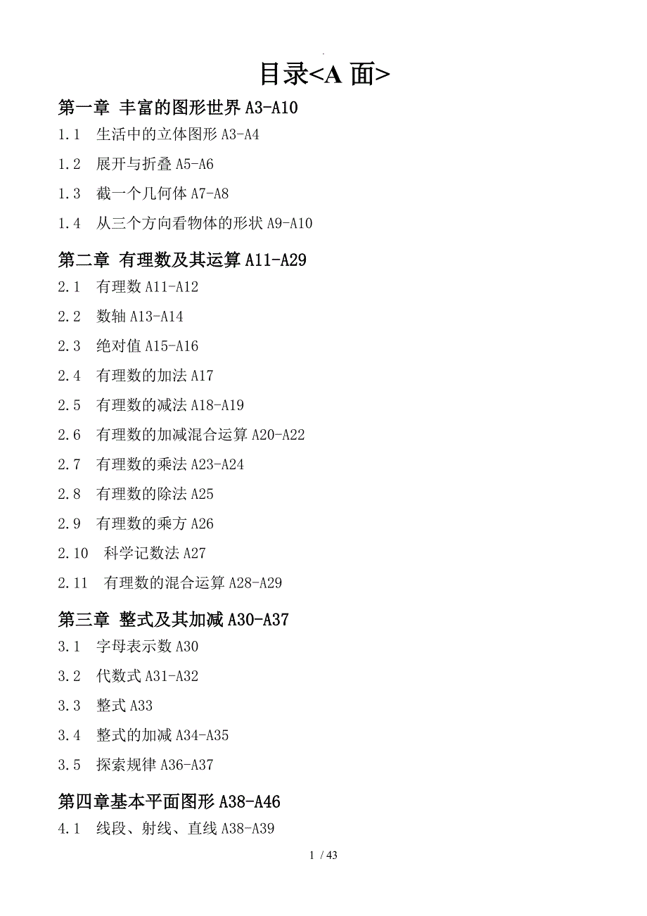 目录第一章 丰富的图形世界A3-A101.1 生活中的立体图形A3-A41.2 展开与折叠A5-A61.3 截一个几何体A7-A81.4 从三个方向看物体的形状A9-A10第二章 有理数及其运算A11-A292.1 有理数A11-A122.2 数轴A13-A142.3 绝对值A15-A162.4 有理数的加法A172.5 有理数的减法A18-A192.6 有理数的加减混合运算A20-A222.7 有理数的乘法A23-A242.8 有理数的除法A252.9 有理数的乘方A262.10 科学记数法A272.11 有理数的混合运算A28-A29第三章 整式及其加减A30-A373.1 字母表示数A303.2 代数式A31-A323.3 整式A333.4 整式的加减A34-A353.5 探索规律A36-A37第四章基本平面图形A38-A464.1 线段、射线、直线A38-A394.2 比较线段的长短A40-A414.3 角A42-A434.4 角的比较A44-A454.5 多边形和圆的初步认识A46第五章 一元一次方程A47-A545.1 认识一元一次方程A47-A485.2 求解一元一次方程A495.3 应用一元一次方程--水箱变高了A50-A515.4 应用一元一次方程-- 打折销售A525.5 应用一元一次方程-- 希望工程义演A535.6 应用一元一次方程-- 能追上小明吗A54第六章 数据的收集与整理A55-A596.1 数据的收集A556.2 普查和抽样调查A566.3 数据的表示A57-A586.4 统计图的选择A59第一章 丰富的图形世界1.1 生活中的立体图形44 / 44.※课时达标1. 立体图形的各个面都是________面,这样 的立体图形称为多面体.2. 图形是由_______,________,________ 构成的.3. 物体的形状似于圆柱的有_____________; 类似于圆锥的有_____________________; 类似于球的有__________________.4. 正方体有_____个顶点,经过每个顶点有 _________条棱,这些棱都____________.5. 圆柱,圆锥,球的共同点是______________ _______________.6.长方体共有〔 条棱. A.8 B.6 C.10 D.127.从一个十边形的某个点出发,分别连接这 个顶点与其余各顶点,可以把这个多边形 分割成< >个三角形 A. 10 B. 9 C. 8 D. 7※课后作业★基础巩固1. 四棱柱是由________个面组成的,且这几 个面是_____________;圆锥是由_______ 个面围,它的侧面是_______,底面是____.2. 假如我们把笔尖看作一个点,当笔尖在纸 上移动时,就能画出线,说明了_________, 时钟秒针旋转时,形成一个圆面,这说明了 _____________,三角板绕它的一条直角边 旋转一周,形成一个圆锥体,这说明了____ _______________.3. 在棱柱中,任何相邻的两个面的交线都叫做_____,相邻的两个侧面的交线叫做 __________.棱柱所有侧棱长都________,上下底面是_____.4. 七棱柱是由个面围成的,它有个顶点,有条棱.5. 一个六棱柱共有条棱,如果六棱柱的 底面边长都是3cm,侧棱长都是2cm,那么 它所有棱长的和是 ___ cm.6.请写出下列几何体的名称. < > < > 〔 < > < > < >7. 用第一行的图形绕轴旋转一周,便得到第二行的几何体,用线连一连.☆能力提升8. 下列几种图形:①三角形;②长方形;③正方体;④圆;⑤圆锥;⑥圆柱. 其中属于立体图形的是〔 . A.③⑤⑥ B.①②③ C.③⑥ D.④⑤9.直角三角形绕它最长边<即斜边>旋转一周得到的几何体为< >.10.六棱锥共有〔 条侧棱. A.6 B.7 C.8 D.1011.下列说法,不正确的是〔 . A.圆锥和圆柱的底面都是圆. B.棱锥底面边数与侧棱数相等. C.棱柱的上、下底面是形状、大小相同 的多边形. D.长方体是四棱柱,四棱柱是长方体.12.第一行的图形绕虚线转一周,能形成第二 行的某个几何体,用线连起来.13.推理猜测题. <1>三棱锥有____条棱,四棱锥有_____条 棱,十棱锥有____条棱. <2>_____棱锥有30条棱. <3>_____棱柱有60条棱. <4>一个多面体的棱数是8,则这个多面的 面数是________.●中考14.右图是由< >图形饶虚线旋转一周形 成的.15.图中为棱柱的是〔 .16.下列说法中,正确的是〔 . A.棱柱的侧面可以是三角形. B.由六个大小一样的正方形所组成的图 形是正方体的展开图. C.正方体的各条棱都相等. D.棱柱的各条棱都相等.17.下列说法错误的是〔 .A.若直棱柱的后面边长都相等,则它的 各个侧面面积相等. B.n棱柱有n个面,n个顶点. C.长方体,正方体都是四棱柱. D.三棱柱的底面是三角形.18.在三棱锥5个面的18个角中,直角最多 有〔 个. A.12个 B.14个 C.16个 D.18个19. 将一个长方形绕它的一边所在的直线旋 转一周,得到的几何体是圆柱,现在有一 个长为4厘米,宽为3厘米的长方形,分 别绕它的长、宽所在的直线旋转一周,得 到不同的圆柱体,它们的体积分别是多 大?.1.2 展开与折叠.※课时达标1.如图所示棱柱: <1>这个棱柱的底面是_______边形. <2>这个棱柱有_______个侧面,侧面的形 状是_______边形. <3>侧面的个数与底面的边数_______. 〔填"相等"或"不相等" <4>这个棱柱有_______条侧棱,一共有 _______条棱. <5>如果CC′=3 cm,那么BB′=_______cm.2. 棱柱中至少有_______个面的形状完全相 同.3.判断题: 〔1长方体和正方体不是棱柱. 〔 〔2五棱柱中五条侧棱长度相同. 〔 〔3三棱柱中底面三条边都相同. 〔 4.长方体共有_______个顶点________个面, 其中有___________对平面相互平行.5.下面图形能围成一个长方体的是〔 .6.圆锥的侧面展开图是< >. A.长方形 B.正方形 C.圆 D.扇形7.下列平面图中不能围成立方体的是< >.※课后作业★基础巩固1.指出下列图形是什么图形的展开图:2.如图,把左边的图形折叠起来,它会变为 〔 .3.下面图形经过折叠不能围成棱柱〔 .4. 如图,把左边的图形折叠起来,它会变成 〔 .5. 一个几何体的边面全部展开后铺在平面 上,不可能是〔 .A.一个三角形 B.一个圆 C.三个正方形 D.一个小圆和半个大圆6.下面图形经过折叠不能围成棱柱的是〔 .7.圆柱的底面是,侧面是, 展开后的侧面是______________.8.圆锥的底面是,侧面