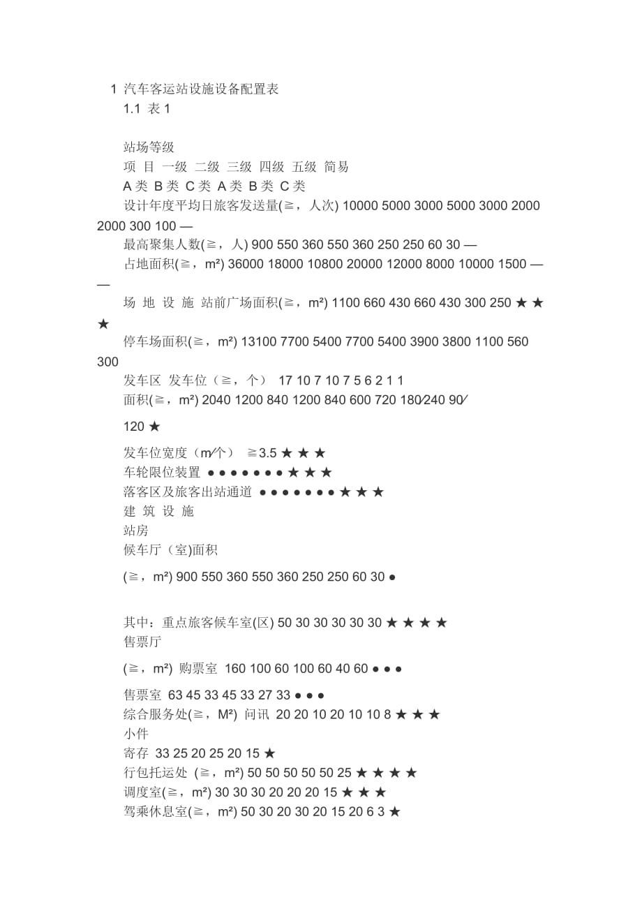 1 汽车客运站设施设备配置表 1.1 表1 站场等级 项 目 一级 二级 三级 四级 五级 简易 A类 B类 C类 A类 B类 C类 设计年度平均日旅客发送量(≧,人次) 10000 5000 3000 5000 3000 2000 2000 300 100 — 最高聚集人数(≧,人) 900 550 360 550 360 250 250 60 30 — 占地面积(≧,m) 36000 18000 10800 20000 12000 8000 10000 1500 — — 场 地 设 施 站前广场面积(≧,m) 1100 660 430 660 430 300 250 ★ ★ ★ 停车场面积(≧,m) 13100 7700 5400 7700 5400 3900 3800 1100 560 300 发车区 发车位(≧,个) 17 10 7 10 7 5 6 2 1 1 面积(≧,m) 2040 1200 840 1200 840 600 720 180∕240 90∕ 120 ★ 发车位宽度(m∕个) ≧3.5 ★ ★ ★ 车轮限位装置 ● ● ● ● ● ● ● ★ ★ ★ 落客区及旅客出站通道 ● ● ● ● ● ● ● ★ ★ ★ 建 筑 设 施 站房 候车厅(室)面积 (≧,m) 900 550 360 550 360 250 250 60 30 ● 其中:重点旅客候车室(区) 50 30 30 30 30 30 ★ ★ ★ ★ 售票厅 (≧,m) 购票室 160 100 60 100 60 40 60 ● ● ● 售票室 63 45 33 45 33 27 33 ● ● ● 综合服务处(≧,M) 问讯 20 20 10 20 10 10 8 ★ ★ ★ 小件 寄存 33 25 20 25 20 15 ★ 行包托运处 (≧,m) 50 50 50 50 50 25 ★ ★ ★ ★ 调度室(≧,m) 30 30 30 20 20 20 15 ★ ★ ★ 驾乘休息室(≧,m) 50 30 20 30 20 15 20 6 3 ★ 站务员室(≧,m) 105 55 40 55 40 30 30 20 10 ★ 治安室 ● ● ● ● ● ● ★ ★ ★ ★ 广播室(≧,m) 10 10 10 10 10 10 ★ ★ ★ ★ 无障碍通道 ● ● ● ● ● ● ● ● ● ★ 残疾人服务设施 ● ● ● ● ● ● ● ● ● ★ 饮水室(处) ● ● ● ● ● ● ★ ★ ★ ★ 盥洗室和旅客厕所 男厕(≧,m) 70 50 37 50 37 30 30 18 8 ● 女厕(≧,m) 83 55 40 55 40 35 35 20 8 ● 智能系统用房 ● ● ● ● ● ● ● ★ ★ ★ 配电室 ● ● ● ● ● ● ★ ★ ★ ★ 医疗救护室 ★ ★ ★ ★ ★ ★ ★ ★ ★ ★ 车辆安检 安检区(≧,m) 160 80 80 80 80 80 80 80 80 60 安检台(槽) (≧,个) 2 1 1 1 1 1 1 1 1 ★ 车辆清洁、清洗台 (≧,m) 180 90 90 90 90 90 ● ★ ★ ★ 注:“●”—必备;“★”—视情况设置;“—”—不作要求。