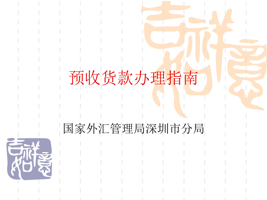 预收货款办理指南国家外汇管理局深圳市分局§自2008年7月14日起,企业新签约出口合同中含预收货款条款和合同中未约定而实际发生预收货款的,应在合同签约之日起或实际收到预收货款之日起15个工作日内,办理预收货款合同登记手续,企业合同中未约定而实际收到预收货款的同时办理预收货款提款登记手续企业按合同约定收到预收货款之日起15个工作日内,办理预收货款提款登记手续 §企业出口买方信贷的提前收汇企业出口买方信贷的提前收汇应办理应办理预收预收货款登记手续企业出口押汇、福费廷、货款登记手续企业出口押汇、福费廷、保理等贸易融资下收汇,保理等贸易融资下收汇,不需要不需要办理预收办理预收货款登记手续货款登记手续§境外银行为境外进口方开立的信用证,其境外银行为境外进口方开立的信用证,其项下境内出口企业的预收货款项下境内出口企业的预收货款应办理应办理预收预收货款登记手续货款登记手续§ 个人对外贸易经营者和保税监管区域内的个人对外贸易经营者和保税监管区域内的企业对境外发生的预收货款企业对境外发生的预收货款纳入纳入管理范围管理范围 §已登记预收货款项下货物报关出口和货物未出口退汇的,企业应在货物报关出口之日起或退汇之日起15个工作日内办理预收货款注销手续。