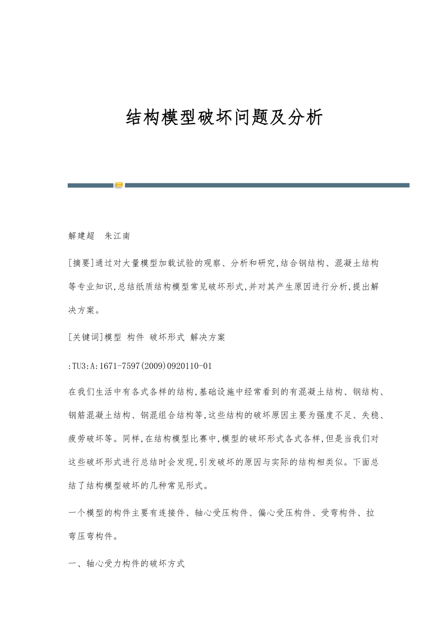 结构模型破坏问题及分析 解建超 朱江南[摘要]通过对大量模型加载试验的观察、分析和研究,结合钢结构、混凝土结构等专业知识,总结纸质结构模型常见破坏形式,并对其产生原因进行分析,提出解决方案[关键词]模型 构件 破坏形式 解决方案:TU3:A:1671-7597(2009)0920110-01在我们生活中有各式各样的结构,基础设施中经常看到的有混凝土结构、钢结构、钢筋混凝土结构、钢混组合结构等,这些结构的破坏原因主要为强度不足、失稳、疲劳破坏等同样,在结构模型比赛中,模型的破坏形式各式各样,但是当我们对这些破坏形式进行总结时会发现,引发破坏的原因与实际的结构相类似下面总结了结构模型破坏的几种常见形式一个模型的构件主要有连接件、轴心受压构件、偏心受压构件、受弯构件、拉弯压弯构件一、轴心受力构件的破坏方式为了了解轴心受力构件的力学性能做了杆件压缩试验,压缩试验是在常温、空气干燥下受到一次单向均匀压缩,在万能试验机上进行,由零缓慢加荷直到试件破坏在电脑上自动生成了应力变形曲线由试验曲线可以得到有用的力学性能指标:抗压强度、弹性模量影响模型构件性能的因素较多,主要是纸的化学成分的影响、制作过程不同的影响、环境温度湿度的影响。