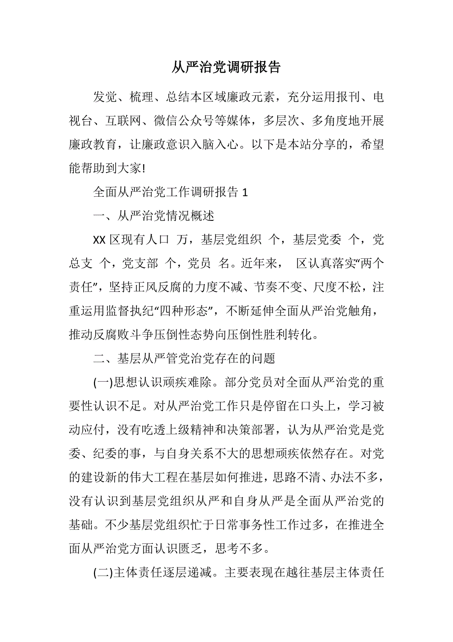 从严治党调研报告 发觉、梳理、总结本区域廉政元素,充分运用报刊、电视台、互联网、公众号等媒体,多层次、多角度地开展廉政教育,让廉政意识入脑入心以下是本站分享的,希望能帮助到大家! 全面从严治党工作调研报告1 一、从严治党情况概述 XX区现有人口 万,基层党组织 个,基层党委 个,党总支 个,党支部 个,党员 名近年来, 区认真落实“两个责任”,坚持正风反腐的力度不减、节奏不变、尺度不松,注重运用监督执纪“四种形态”,不断延伸全面从严治党触角,推动反腐败斗争压倒性态势向压倒性胜利转化 二、基层从严管党治党存在的问题 (一)思想认识顽疾难除部分党员对全面从严治党的重要性认识不足对从严治党工作只是停留在口头上,学习被动应付,没有吃透上级精神和决策部署,认为从严治党是党委、纪委的事,与自身关系不大的思想顽疾依然存在对党的建设新的伟大工程在基层如何推进,思路不清、办法不多,没有认识到基层党组织从严和自身从严是全面从严治党的基础不少基层党组织忙于日常事务性工作过多,在推进全面从严治党方面认识匮乏,思考不多 (二)主体责任逐层递减主要表现在越往基层主体责任落实越不力部分乡镇党委对主体责任重视程度不够,工作消极被动多,主动谋划少,党风廉政建设依然存在重形式轻内容情况。