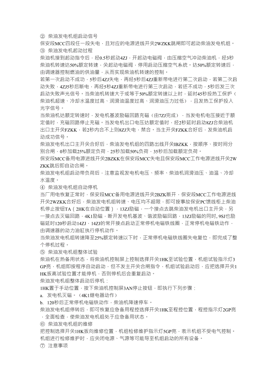 ② 柴油发电机组启动信号保安段MCC四段任一段失电,且对应的电源进线开关2WZKK跳闸即可起动柴油发电机组③ 柴油发电机起动过程柴油机接到起动指令后,经0.5秒起动4ZJ,开起动电磁阀,由压缩空气冲动柴油机,经3秒柴油机转速达50%额定转速,关起动电磁阀,停用启动压缩空气系统达50%额定转速后,由调速器控制燃油的供油量,从而实现柴油机转速的控制若第一次启动不成功,5秒后4ZJ失电,再经5秒后4ZJ重新带电进行第二次启动,若第二次启动失败,4ZJ5秒后断电,再经5秒4ZJ重新带电进行第三次启动,若还不成功,5秒后发三次启动失败声光信号当柴油机转速大于或等于50%额定转速以上时,延时45秒投热工保护(柴油机超速、冷却水温度过高、润滑油温度过高、润滑油压力过低),且发热工保护投入光字信号当柴油机达额定转速时,发电机基波励磁回路充磁(由7ZJ完成),当发电机电压接近于额定值时,充磁回路停止充磁当发电机出口电压达额定值时,经2秒延时启动8ZJ合柴油机出口主开关FZKK,若2秒内合不上则8ZJ失电,禁合当主开关FZKK合好后,发柴油机启动成功信号柴油发电机出口主开关合好后,柴油发电机组的四路出线开关lBZKK,按顺序、按时间分别合闸,0秒加载25%额定负荷,25秒加载50%负荷,35秒后加载额定负荷。