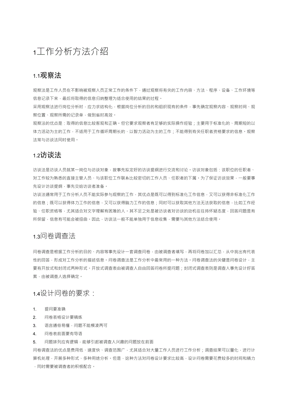 1工作分析方法介绍1.1观察法观察法是工作人员在不影响被观察人员正常工作的条件下,通过观察将有关的工作内容、方法、程序、设备、工作环境等信息记录下来,最后将取得的信息归纳整理为适合使用的结果的过程采用观察法进行岗位分析时,应力求结构化,根据岗位分析的目的和组织现有的条件,事先确定观察内容、观察时间、观察位置、观察所需的记录单,做到省时高效观察法的优点是:取得的信息比较客观和正确但它要求观察者有足够的实际操作经验;主要用于标准化的、周期短的以体力活动为主的工作,不适用于工作循环周期长的、以智力活动为主的工作;不能得到有关任职者资格要求的信息观察法常与访谈法同时使用1.2访谈法访谈法是访谈人员就某一岗位与访谈对象,按事先拟定好的访谈提纲进行交流和讨论访谈对象包括:该职位的任职者、对工作较为熟悉的直接主管人员、与该职位工作联系比较密切的工作人员、任职者的下属为了保证访谈效果,一般要事先设计访谈提纲,事先交给访谈者准备访谈法通常用于工作分析人员不能实际参与观察的工作,其优点是既可以得到标准化工作信息,又可以获得非标准化工作的信息;既可以获得体力工作的信息,又可以获得脑力工作的信息;同时可以获取其他方法无法获取的信息,比如工作经验、任职资格等,尤其适合对文字理解有困难的人。