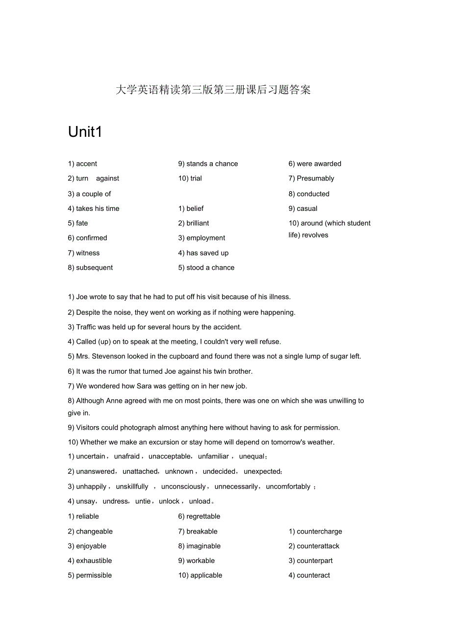 大学英语精读第三版第三册课后习题答案Unit11) accent 2) turn against 3) a couple of 4) takes his time 5) fate 6) confirmed 7) witness 8) subsequent 9) stands a chance 10) trial 1) belief 2) brilliant 3) employment 4) has saved up 5) stood a chance 6) were awarded 7) Presumably 8) conducted 9) casual 10) around (which student life) revolves 1) Joe wrote to say that he had to put off his visit because of his illness. 2) Despite the noise, they went on working as if nothing were happening. 3) Traffic was held up for several hours by the accident. 4) Called (up) on to speak at the meeting, I couldnt very well refuse. 5) Mrs. Stevenson looked in the cupboard and found there was not a single lump of sugar left. 6) It was the rumor that turned Joe against his twin brother. 7) We wondered how Sara was getting on in her new job. 8) Although Anne agreed with me on most points, there was one on which she was unwilling to give in. 9) Visitors could photograph almost anything here without having to ask for permission. 10) Whether we make an excursion or stay home will depend on tomorrows weather. 1) uncertain,unafraid,unacceptable,unfamiliar ,unequal;2) unanswered,unattached,unknown,undecided, unexpected;3) unhappily ,unskillfully ,unconsciously,unnecessarily,uncomfortably ;4) unsay,undress,untie,unlock ,unload。