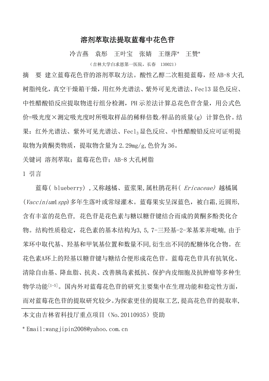 溶剂萃取法提取蓝莓中花色苷 冷吉燕 袁彤 王叶宝 张婧 王继萍* 王赞* (吉林大学白求恩第一医院,长春 130021)摘 要 建立蓝莓花色苷的溶剂萃取方法酸性乙醇二次粗提蓝莓,经AB-8大孔树脂纯化,真空干燥箱干燥,用红外光谱法、紫外可见光谱法、Fecl3显色反应、中性醋酸铅反应提取物进行组分检测,PH示差法计算总花色苷含量,用公式色价=吸光度×测定吸光度时所吸取样品的稀释倍数/样品的质量(g) 计算色价结果:红外光谱法、紫外可见光谱法、Fecl3显色反应、中性醋酸铅反应可证明提取物为黄酮类物质,提取物含量为2.29mg/g,色价为36关键词 溶剂萃取;蓝莓花色苷;AB-8大孔树脂1 引言蓝莓( blueberry) ,又称越橘、蓝浆果,属杜鹃花科( Ericaceae) 越橘属(Vaccinium1spp)多年生落叶或常绿灌木蓝莓果实呈深蓝色,被白霜,近圆形,含有丰富的花色苷, 花色苷是花色素与糖以糖苷键结合而成的黄酮多酚类化合物结构性质稳定,花色素的基本结构为3, 5, 7-三羟基-2-苯基苯并吡喃, 由于苯环中取代基、羟基和甲氧基位置和数量不同,衍生出不同的配糖体化合物。