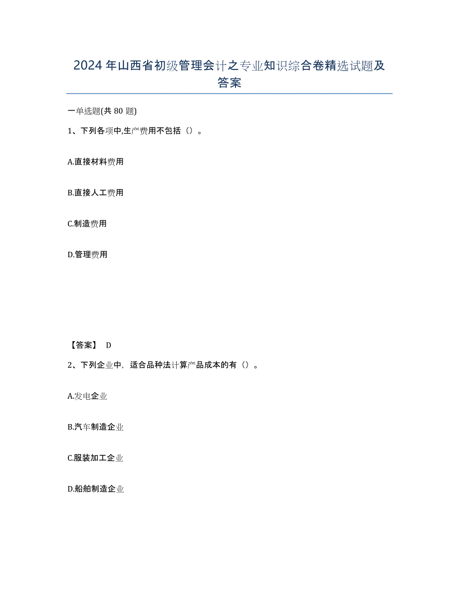 2024年山西省初级管理会计之专业知识综合卷精选试题及答案一单选题(共80题)1、下列各项中,生产费用不包括()A.直接材料费用B.直接人工费用C.制造费用D.管理费用【答案】 D2、下列企业中,适合品种法计算产品成本的有()A.发电企业B.汽车制造企业C.服装加工企业D.船舶制造企业【答案】 A3、企业总体战略确定后,需要通过()引领和驱动企业资源安排和各项活动的优先级别A.投资B.采购C.销售D.生产【答案】 A4、在预算制度中,不包含()A.预算编制周期B.预算的整体规模C.参加人员D.预算的作用E.相关流程和政策【答案】 B5、生产耗费在完工产品和在产品之间的分配主要与()密切相关A.企业的管理水平B.企业的生产特点C.客户的订单需求D.企业的资金状况【答案】 B6、采用分步法计算产品成本的企业是()A.单件小批量生产B.大量大批单步骤生产C.大量大批装配式流水线生产D.分批生产【答案】 C7、由于材料质量、工艺过程本身等特点造成的等级产品,可按分类法计算该类产品的联合成本,在各种等级产品之间分配联合成本时可采用的方法是()A.约当产量比例法B.单位售价比例法C.计划产量比例法D.标准产量比例法【答案】 B8、逐步结转分步法下,加权平均法的约当总产量是()。