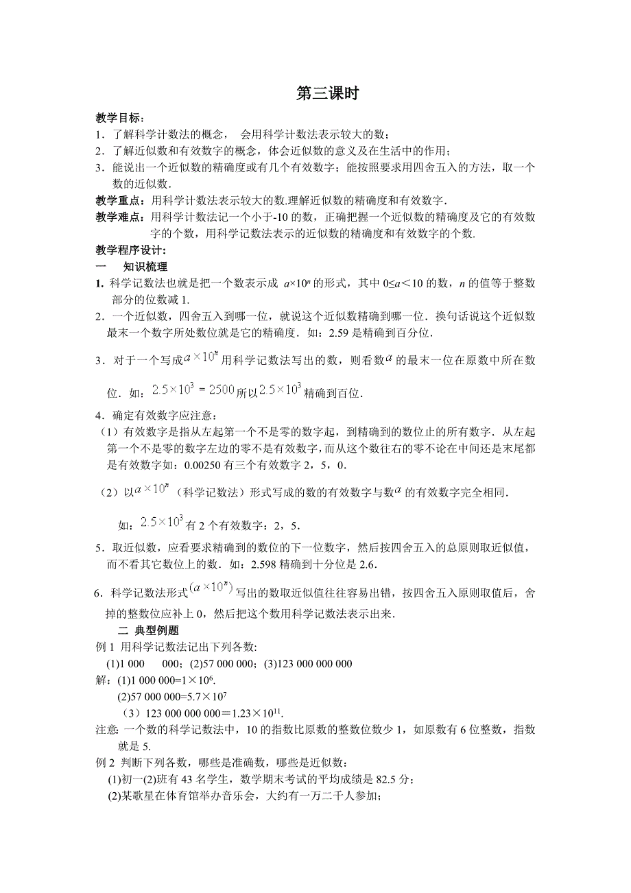 第三课时教学目标:1.了解科学计数法的概念, 会用科学计数法表示较大的数; 2.了解近似数和有效数字的概念,体会近似数的意义及在生活中的作用;3.能说出一个近似数的精确度或有几个有效数字;能按照要求用四舍五入的方法,取一个数的近似数.教学重点:用科学计数法表示较大的数.理解近似数的精确度和有效数字.教学难点:用科学计数法记一个小于-10的数,正确把握一个近似数的精确度及它的有效数字的个数,用科学记数法表示的近似数的精确度和有效数字的个数.教学程序设计:一 知识梳理1. 科学记数法也就是把一个数表示成 a×10n的形式,其中0≤a<10的数,n的值等于整数部分的位数减1.2.一个近似数,四舍五入到哪一位,就说这个近似数精确到哪一位.换句话说这个近似数最末一个数字所处数位就是它的精确度.如:2.59是精确到百分位.3.对于一个写成用科学记数法写出的数,则看数的最末一位在原数中所在数位.如:所以精确到百位.4.确定有效数字应注意:(1)有效数字是指从左起第一个不是零的数字起,到精确到的数位止的所有数字.从左起第一个不是零的数字左边的零不是有效数字,而从这个数往右的零不论在中间还是末尾都是有效数字如:0.00250有三个有效数字2,5,0.(2)以(科学记数法)形式写成的数的有效数字与数的有效数字完全相同.如:有2个有效数字:2,5. 5.取近似数,应看要求精确到的数位的下一位数字,然后按四舍五入的总原则取近似值,而不看其它数位上的数.如:2.598精确到十分位是2.6.6.科学记数法形式写出的数取近似值往往容易出错,按四舍五入原则取值后,舍掉的整数位应补上0,然后把这个数用科学记数法表示出来.二 典型例题例1 用科学记数法记出下列各数:(1)1 000 000;(2)57 000 000;(3)123 000 000 000解:(1)1 000 000=1×106.(2)57 000 000=5.7×107(3)123 000 000 000=1.23×1011. 注意:一个数的科学记数法中,10的指数比原数的整数位数少1,如原数有6位整数,指数就是5.例2 判断下列各数,哪些是准确数,哪些是近似数: (1)初一(2)班有43名学生,数学期末考试的平均成绩是82.5分; (2)某歌星在体育馆举办音乐会,大约有一万二千人参加; (3)通过计算,直径为10cm的圆的周长是31.4cm; (4)检查一双没洗过的手,发现带有各种细菌80000万个; (5)1999年我国国民经济增长7.8%. 解:(1)43是准确数.因为43是质数,求平均数时不一定除得尽,所以82.5一般是近似数; (2)一万二千是近似数; (3)10是准确数,因为3.14是π的近似值,所以31.4是近似数; (4)80000万是近似数; (5)1999是准确数,7.8%是近似数. 说明:1.在近似数的计算中,分清准确数和近似数是很重要的,它是决定我们用近似计算法则进行计算,还是用一般方法进行计算的依据.产生近似数的主要原因: (1)“计算”产生近似数.如除不尽,有圆周率π参加计算的结果等等; (2)用测量工具测出的量一般都是近似数,如长度、重量、时间等等; (3)不容易得到,或不可能得到准确数时,只能得到近似数,如人口普查的结果,就只能是一个近似数; (4)由于不必要知道准确数而产生近似数.例3 下列由四舍五入得到的近似数,各精确到哪一位?各有哪几个有效数字? (1)38200 (2)0.040 (3)20.05000 (4)4×104 分析:对于一个四舍五入得到的近似数,如果是整数,如38200,就精确到个位;如果有一位小数,就精确到十分位;两位小数,就精确到百分位;象0.040有三位小数就精确到千分位;象20.05000就精确到十万分位;而4×104=40000,只有一个有效数字4,则精确到万位.有效数字的个数应按照定义计算. 解:(1)38200精确到个位,有五个有效数字3、8、2、0、0. (2)0.040精确到千分位(即精确到0.001)有两个有效数字4、0. (3)20.05000精确到十万分位(即精确到0.00001),有七个有效数字2、0、0、5、0、0、0. (4)4×104精确到万位,有一个有效数字4. 说明:(1)一个近似数的位数与精确度有关,不能随意添上或去掉末位的零.如20.05000的有效数字是2、0、0、5、0、0、0七个.而20.05的有效数字是2、0、0、5四个.因为20.05000精确到0.00001,而20.05精确到0.01,精确度不一样,有效数字也不同,所以右边的三个0不能随意去掉.(2)对有效数字,如0.040,4左边的两个0不是有效数字,4右边的0是有效数字. (3)近似数40000与4×104有区别,40000表示精确到个位,有五个有效数字4、0、0、0、0,而4×104表示精确到万位,有1个有效数字4. 例4 下列由四舍五入得到的近似数,各精确到哪一位?各有几个有效数字? (1)70万 (2)9.03万 (3)1.8亿 (4)6.40×105 分析:因为这四个数都是近似数,所以 (1)的有效数字是2个:7、0,0不是个位,而是“万”位; (2)的有效数字是3个:9、0、3,3不是百分位,而是“百”位; (3)的有效数字是2个:1、8,8不是十分位,而是“千万”位; (4)的有效数字是3个:6、4、0,0不是百分位,而是“千”位. 解:(1)70万. 精确到万位,有2个有效数字7、0; (2)9.03万.精确到百位,有3个有效数字9、0、3; (3)1.8亿.精确到千万位,有2个有效数字1、8; (4)6.40×105.精确到千位,有3个有效数字6、4、0. 说明:较大的数取近似值时,常用×万,×亿等等来表示,这里的“×”表示这个近似数的有效数字,而它精确到的位数不一定是“万”或“亿”.对于不熟练的学生,应当写出原数之后再判断精确到哪一位,例如9.03万=90300,因为“3”在百位上,所以9.03万精确到百位.例5 用四舍五入法,按括号里的要求对下列各数取近似值. (1)1.5982(精确到0.01) (2)0.03049(保留两个有效数字) (3)3.3074(精确到个位) (4)81.661(保留三个有效数字) 分析:四舍五入是指要精确到的那一位