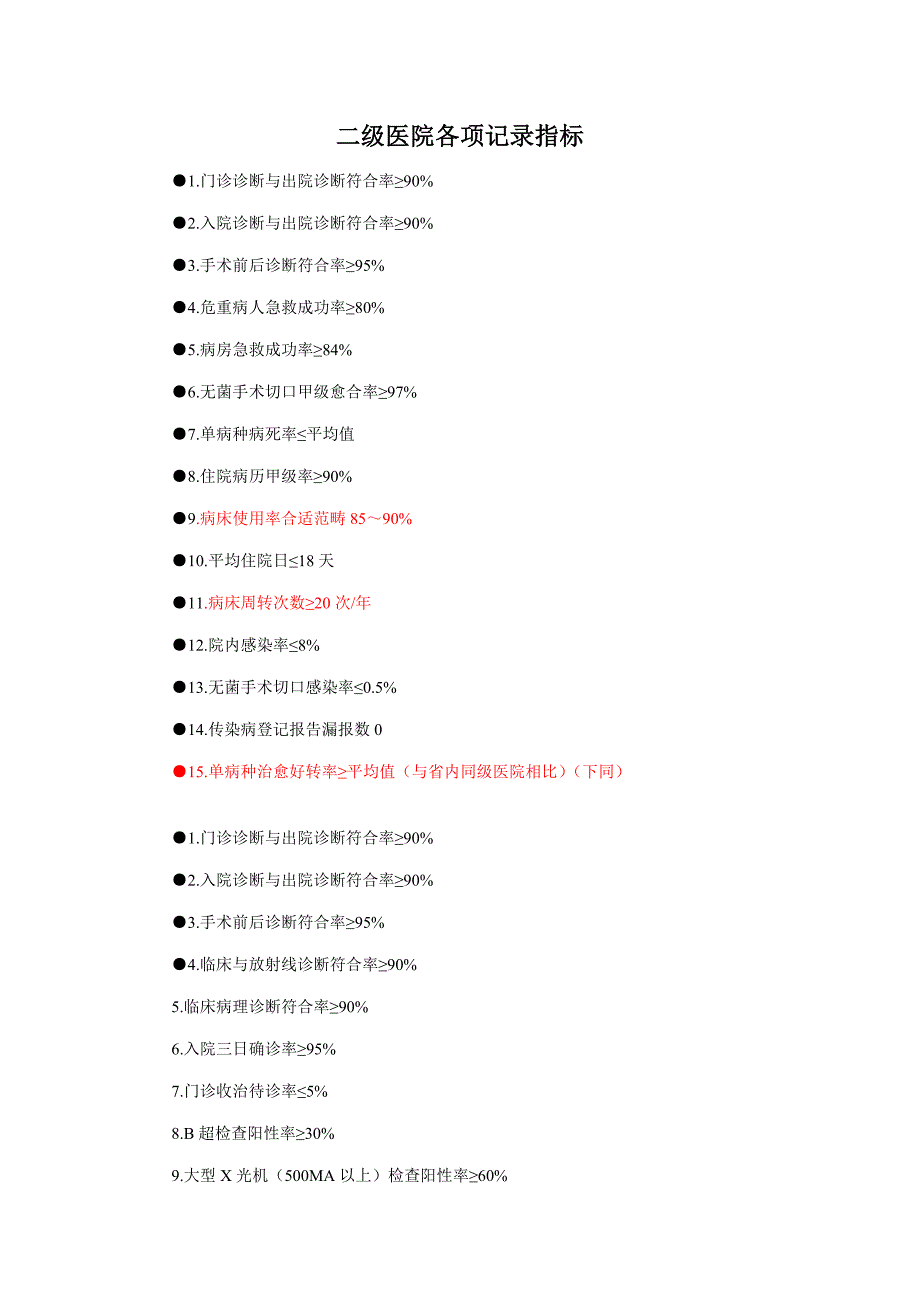 二级医院各项记录指标 ●1.门诊诊断与出院诊断符合率≥90% ●2.入院诊断与出院诊断符合率≥90% ●3.手术前后诊断符合率≥95% ●4.危重病人急救成功率≥80% ●5.病房急救成功率≥84% ●6.无菌手术切口甲级愈合率≥97% ●7.单病种病死率≤平均值●8.住院病历甲级率≥90%●9.病床使用率合适范畴85~90% ●10.平均住院日≤18天 ●11.病床周转次数≥20次/年 ●12.院内感染率≤8% ●13.无菌手术切口感染率≤0.5%●14.传染病登记报告漏报数0●15.单病种治愈好转率≥平均值(与省内同级医院相比)(下同)●1.门诊诊断与出院诊断符合率≥90% ●2.入院诊断与出院诊断符合率≥90% ●3.手术前后诊断符合率≥95% ●4.临床与放射线诊断符合率≥90% 5.临床病理诊断符合率≥90% 6.入院三日确诊率≥95% 7.门诊收治待诊率≤5% 8.B超检查阳性率≥30% 9.大型X光机(500MA以上)检查阳性率≥60% 10.临床化学室间质评实验室年平均每次VIS<150 11.临床化学室内质控各项CV值在允误差范畴内 12.细菌质控,参与 13.尸检率≥10% ●14.单病种治愈好转率≥平均值(与省内同级医院相比)(下同) ●15.危重病人急救成功率≥80% ●16.病房急救成功率≥84% ●17.无菌手术切口甲级愈合率≥97% ●18.单病种病死率≤平均值 19.住院产妇死亡率≤0.02% 20.活产新生儿死亡率≤0.5% 21.单病种术后十日内死亡率≤平均值 22.麻醉死亡率≤0.02% 23.门诊处方合格率≥98% 24.门诊病历书写合格率≥90% ●25.住院病历甲级率≥90% 26.X光摄片甲级片率≥40% 27.护理技术操作合格率≥90% 28.基本护理合格率≥90% 29.特护、一级护理合格率≥90% 30.五种表格书写合格率≥98% 31.常规器械消毒合格率≥98% 32.责任制护理病区数≤10% 33.陪护率≥8% 34.住院病人就餐率≥80% 35.治疗饮食就餐率100% ●36.病床使用率合适范畴85~90% ●37.平均住院日≤18天 ●38.病床周转次数≥20次/年 39.副主任医师以上出门诊≥2次/周 40.医疗仪器设备完好率80% ●41.院内感染率≤8% ●42.无菌手术切口感染率≤0.5% 43.昏迷、瘫痪病人褥疮发生数0 ●44.传染病登记报告漏报数0 45.年一级以上责任医疗事故发生数0 医疗事故对旳解决率100% 46.每百张病床年严重差错发生数<1 47.年意外事故发生次数0 (含火灾、爆炸、房屋倒塌、导致工作人员人身伤害者) 48.平均单病种医疗费用≤平均值 49.平均每门诊人次医药费用≤平均值 50.卫生技术人员三基考核合格率100%51.一人一针一管执行率100% 。