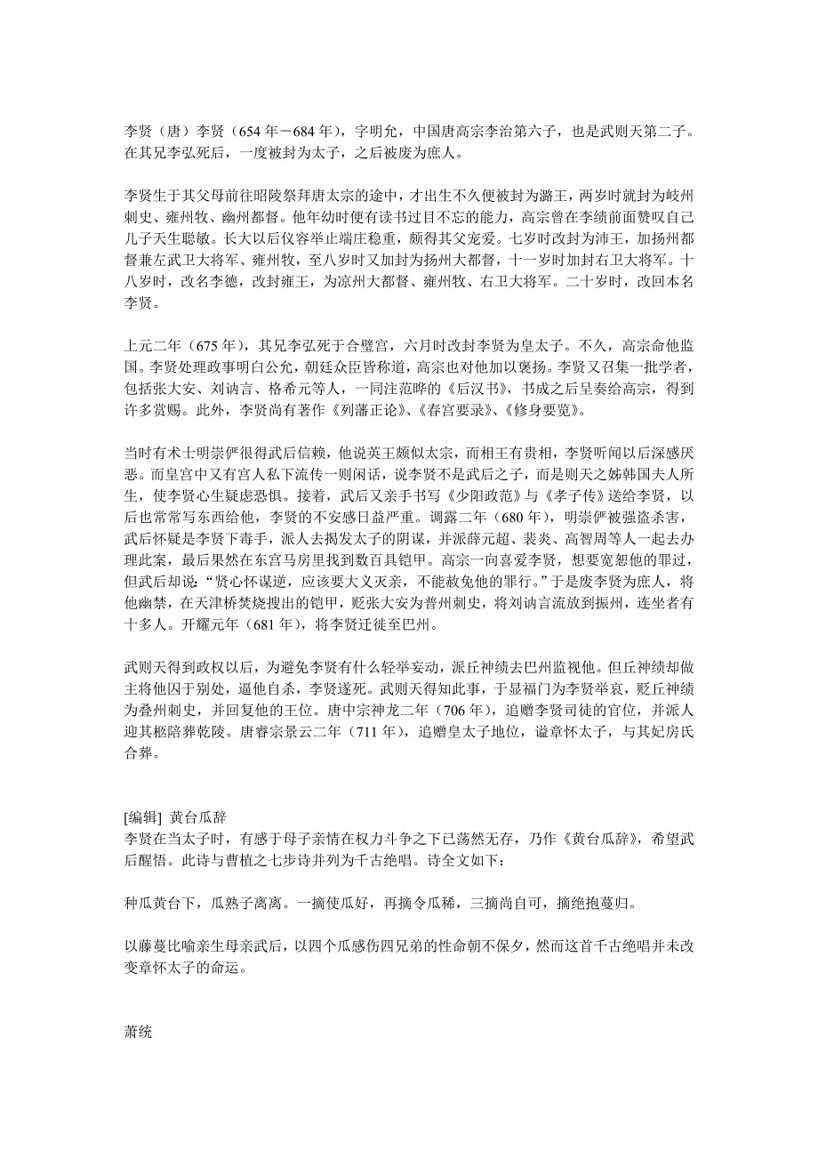 李贤(唐)李贤(654 年-684 年) ,字明允,中国唐高宗李治第六子,也是武则天第二子 在其兄李弘死后,一度被封为太子,之后被废为庶人李贤生于其父母前往昭陵祭拜唐太宗的途中,才出生不久便被封为潞王,两岁时就封为岐 州刺史、雍州牧、幽州都督他年幼时便有读书过目不忘的能力,高宗曾在李绩前面赞叹 自己儿子天生聪敏长大以后仪容举止端庄稳重,颇得其父宠爱七岁时改封为沛王,加 扬州都督兼左武卫大将军、雍州牧,至八岁时又加封为扬州大都督,十一岁时加封右卫大 将军十八岁时,改名李德,改封雍王,为凉州大都督、雍州牧、右卫大将军二十岁时, 改回本名李贤上元二年(675 年) ,其兄李弘死于合璧宫,六月时改封李贤为皇太子不久,高宗命他监 国李贤处理政事明白公允,朝廷众臣皆称道,高宗也对他加以褒扬李贤又召集一批学 者,包括张大安、刘讷言、格希元等人,一同注范晔的《后汉书》 ,书成之后呈奏给高宗, 得到许多赏赐此外,李贤尚有著作《列藩正论》 、 《春宫要录》 、 《修身要览》 当时有术士明崇俨很得武后信赖,他说英王颇似太宗,而相王有贵相,李贤听闻以后深感 厌恶而皇宫中又有宫人私下流传一则闲话,说李贤不是武后之子,而是则天之姊韩国夫 人所生,使李贤心生疑虑恐惧。