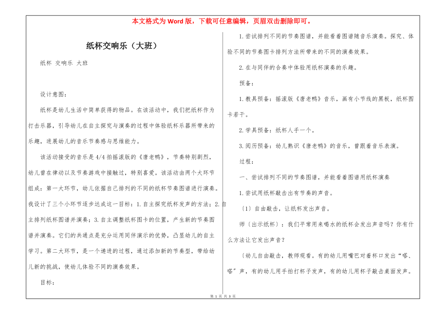 本文格式为Word版,下载可任意编辑,页眉双击删除即可纸杯交响乐(大班)纸杯 交响乐 大班 设计意图: 纸杯是幼儿生活中简单获得的物品在该活动中,我们把纸杯作为打击乐器,引导幼儿在自主探究与演奏的过程中体验纸杯乐器所带来的乐趣,进展幼儿的音乐节奏感与思维能力 该活动接受的音乐是4/4拍摇滚版的《唐老鸭》,节奏特别剧烈,幼儿曾在律动以及节奏游戏中接触过,特别喜爱该活动由两个大环节组成:第一大环节,幼儿依据自己排列的不同的纸杯节奏图谱进行演奏我设计了三个小环节逐步达成这一目标:1.自主探究纸杯发声的方法;2.自主排列纸杯图谱并演奏;3.自主调整纸杯图卡的位置,产生新的节奏图谱并演奏它们的共通点是充分运用同伴演示的优势,凸显幼儿的自主学习第二大环节,是一个递进的过程,通过添加新的节奏型,带给幼儿新的挑战,使幼儿体验不同的演奏效果 目标: 1.尝试排列不同的节奏图谱,并能看着图谱随音乐演奏探究、体验不同的节奏图卡排列方法所带来的不同的演奏效果 2.在与同伴的合奏中体验用纸杯演奏的乐趣 预备: 1.教具预备:摇滚版《唐老鸭》音乐,画有小节线的黑板,纸杯图卡若干 2.学具预备:纸杯人手一个。