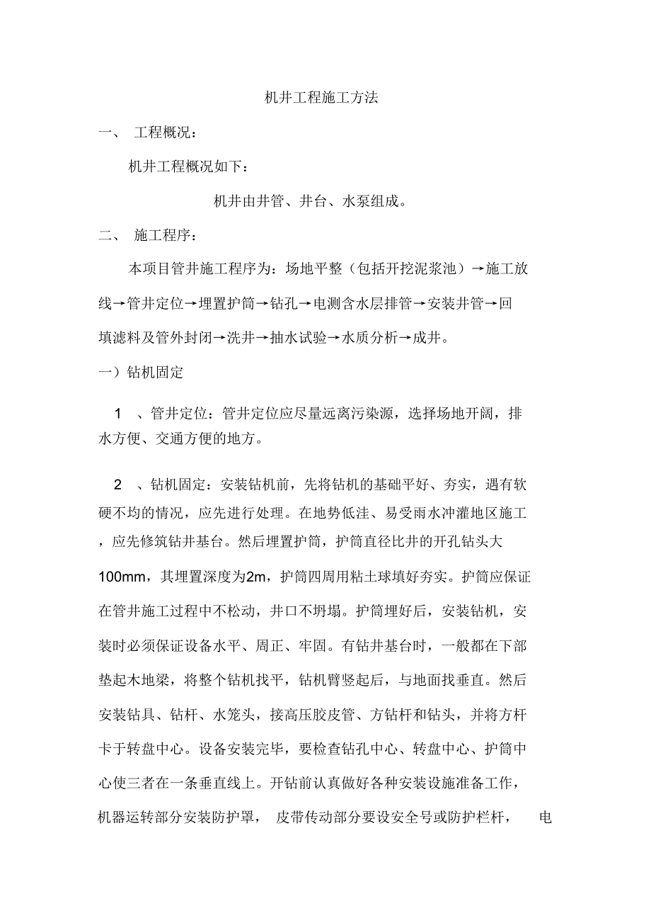 机井工程施工方法一、 工程概况:机井工程概况如下:机井由井管、井台、水泵组成二、 施工程序:本项目管井施工程序为:场地平整(包括开挖泥浆池)→施工放线→管井定位→埋置护筒→钻孔→电测含水层排管→安装井管→回填滤料及管外封闭→洗井→抽水试验→水质分析→成井一)钻机固定1 、管井定位:管井定位应尽量远离污染源,选择场地开阔,排水方便、交通方便的地方2 、钻机固定:安装钻机前,先将钻机的基础平好、夯实,遇有软硬不均的情况,应先进行处理在地势低洼、易受雨水冲灌地区施工,应先修筑钻井基台然后埋置护筒,护筒直径比井的开孔钻头大100mm,其埋置深度为 2m,护筒四周用粘土球填好夯实护筒应保证在管井施工过程中不松动,井口不坍塌护筒埋好后,安装钻机,安装时必须保证设备水平、周正、牢固有钻井基台时,一般都在下部垫起木地梁,将整个钻机找平,钻机臂竖起后,与地面找垂直然后安装钻具、钻杆、水笼头,接高压胶皮管、方钻杆和钻头,并将方杆卡于转盘中心设备安装完毕,要检查钻孔中心、转盘中心、护筒中心使三者在一条垂直线上开钻前认真做好各种安装设施准备工作,机器运转部分安装防护罩, 皮带传动部分要设安全号或防护栏杆, 电动机等设备的外壳应有接地线。