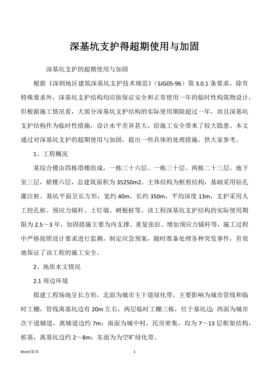 深基坑支护得超期使用与加固 深基坑支护的超期使用与加固 根据《深圳地区建筑深基坑支护技术规范》(SJG05-96)第3.0.1条要求,除有特殊要求外,深基坑支护结构均应按保证安全和正常使用一年的临时性构筑物设计,但根据施工情况看,大部分深基坑支护结构的实际使用期限超过一年,而且深基坑支护结构作为临时性措施,设计水平差异甚大,给施工安全带来了较大隐患本文通过对深基坑支护的超期使用与加固,提出一些具体的处理措施,供大家参考 1、工程概况 某综合楼由四栋塔楼组成,一栋三十六层、一栋三十层、两栋二十三层,地下室三层,裙楼六层,总建筑面积为35250m2主体结构为框剪结构,基础采用钻孔灌注桩基坑平面呈长方形,宽约40m,长约350m,平均深度13m,支护采用人工挖孔桩、预应力锚杆、土钉墙、树根桩等该工程深基坑支护结构的实际使用期限为2.5~3年,加固措施主要为内支撑、重复张拉、增加预应力锚杆等,施工过程中严格按照设计要求进行监测,制定应急预案,随时准备处理各种突发事件,有效地保证了该工程的施工安全 2、地质水文情况 2.1周边环境 拟建工程场地呈长方形,北面为城市主干道绿化带,主要影响为城市管线和临时工棚,管线离基坑边有20m左右,两层临时工棚三栋,位于基坑边;西面为城市次干道辅道,离辅道边约7m;南面为城中村,民房密集,均为7~13层框架结构,桩基,离基坑边约2~8m;东面为为空旷绿化带。