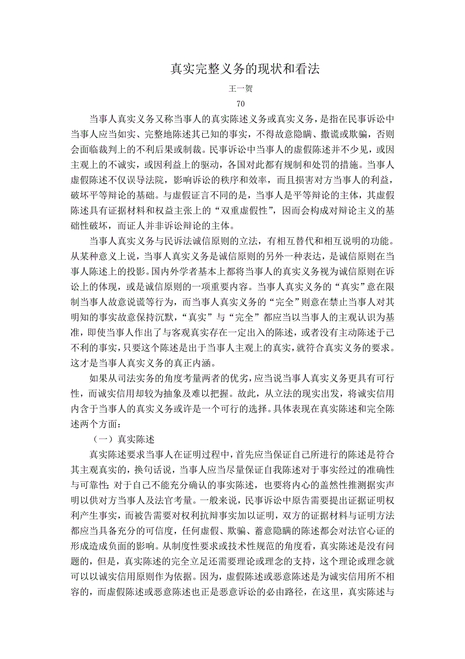 真实完整义务的现状和看法王一贺70当事人真实义务又称当事人的真实陈述义务或真实义务,是指在民事诉讼中当事人应当如实、完整地陈述其已知的事实,不得故意隐瞒、撒谎或欺骗,否则会面临裁判上的不利后果或制裁民事诉讼中当事人的虚假陈述并不少见,或因主观上的不诚实,或因利益上的驱动,各国对此都有规制和处罚的措施当事人虚假陈述不仅误导法院,影响诉讼的秩序和效率,而且损害对方当事人的利益,破坏平等辩论的基础与虚假证言不同的是,当事人是平等辩论的主体,其虚假陈述具有证据材料和权益主张上的“双重虚假性”,因而会构成对辩论主义的基础性破坏,而证人并非诉讼辩论的主体当事人真实义务与民诉法诚信原则的立法,有相互替代和相互说明的功能从某种意义上说,当事人真实义务是诚信原则的另外一种表达,是诚信原则在当事人陈述上的投影国内外学者基本上都将当事人的真实义务视为诚信原则在诉讼上的体现,或是诚信原则的一项重要内容当事人真实义务的“真实”意在限制当事人故意说谎等行为,而当事人真实义务的“完全”则意在禁止当事人对其明知的事实故意保持沉默,“真实”与“完全”都应当以当事人的主观认识为基准,即使当事人作出了与客观真实存在一定出入的陈述,或者没有主动陈述于己不利的事实,只要这个陈述是出于当事人主观上的真实,就符合真实义务的要求。