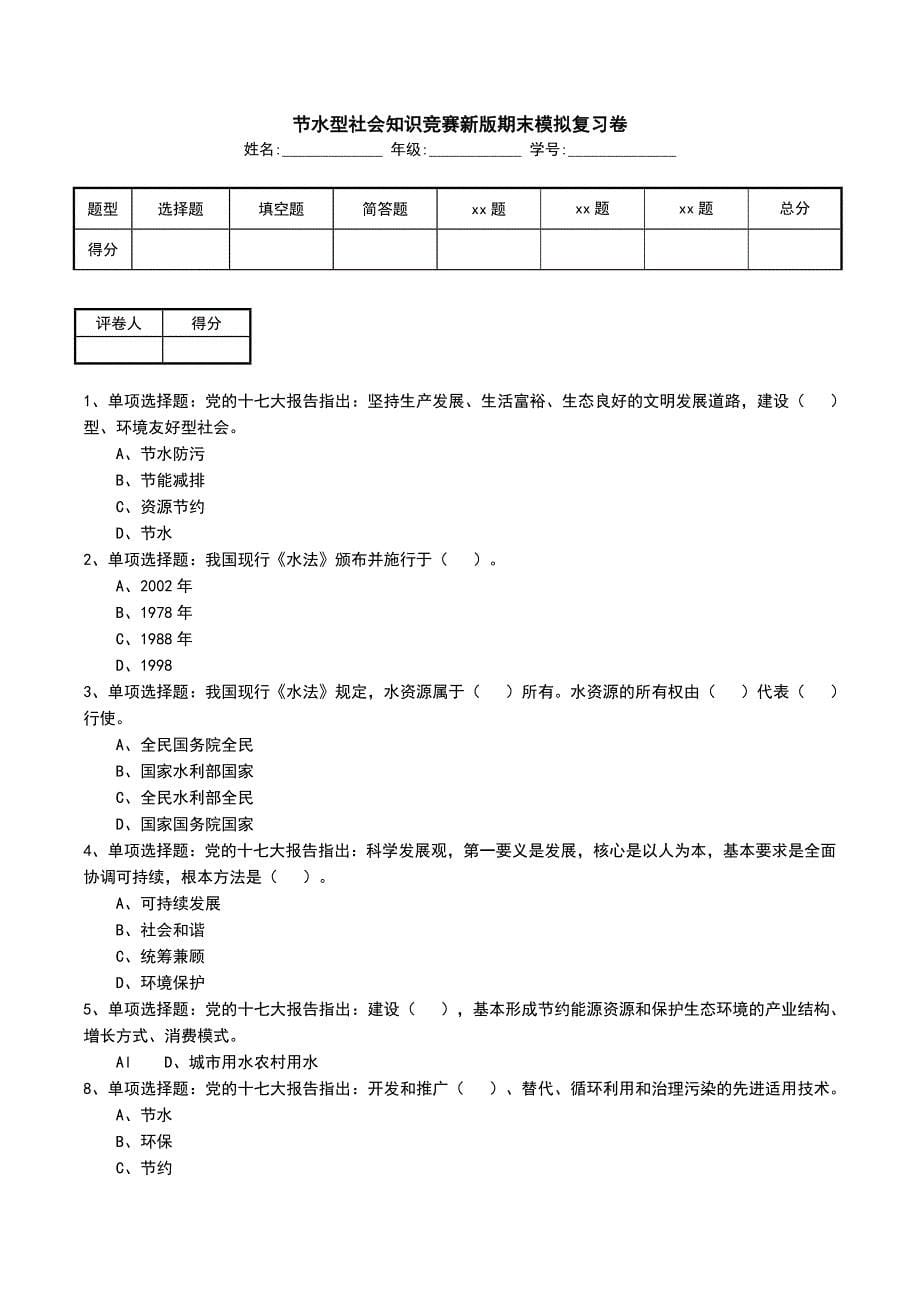 节水型社会知识竞赛新版期末模拟复习卷姓名:_____________ 年级:____________ 学号:______________题型选择题填空题简答题xx题xx题xx题总分得分评卷人得分1、单项选择题:党的十七大报告指出:坚持生产发展、生活富裕、生态良好的文明发展道路,建设( )型、环境友好型社会 A、节水防污 B、节能减排 C、资源节约 D、节水2、单项选择题:我国现行《水法》颁布并施行于( ) A、2002年 B、1978年 C、1988年 D、19983、单项选择题:我国现行《水法》规定,水资源属于( )所有水资源的所有权由( )代表( )行使 A、全民国务院全民 B、国家水利部国家 C、全民水利部全民 D、国家国务院国家4、单项选择题:党的十七大报告指出:科学发展观,第一要义是发展,核心是以人为本,基本要求是全面协调可持续,根本方法是( ) A、可持续发展 B、社会和谐 C、统筹兼顾 D、环境保护5、单项选择题:党的十七大报告指出:建设( ),基本形成节约能源资源和保护生态环境的产业结构、增长方式、消费模式。