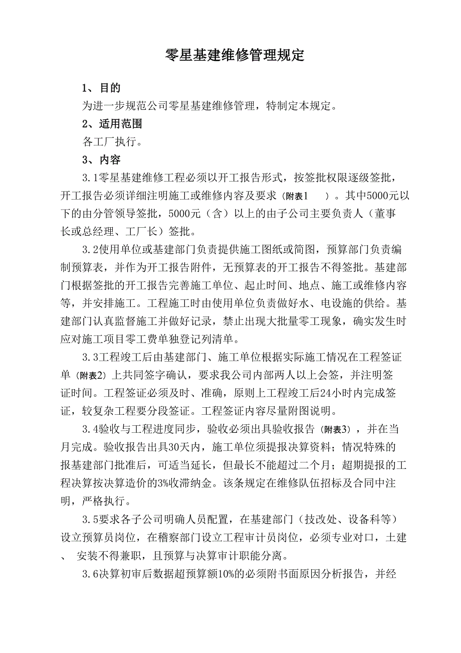 零星基建维修管理规定1、 目的为进一步规范公司零星基建维修管理,特制定本规定2、 适用范围各工厂执行3、 内容3.1零星基建维修工程必须以开工报告形式,按签批权限逐级签批, 开工报告必须详细注明施工或维修内容及要求(附表1 )其中5000元以 下的由分管领导签批,5000元(含)以上的由子公司主要负责人(董事 长或总经理、工厂长)签批3.2使用单位或基建部门负责提供施工图纸或简图,预算部门负责编 制预算表,并作为开工报告附件,无预算表的开工报告不得签批基建部 门根据签批的开工报告完善施工单位、起止时间、地点、施工或维修内容 等,并安排施工工程施工时由使用单位负责做好水、电设施的供给基 建部门认真监督施工并做好记录,禁止出现大批量零工现象,确实发生时 应对施工项目零工费单独登记列清单3.3工程竣工后由基建部门、施工单位根据实际施工情况在工程签证 单(附表2)上共同签字确认,要求我公司内部两人以上会签,并注明签 证时间工程签证必须及时、准确,原则上工程竣工后24小时内完成签 证,较复杂工程要分段签证工程签证内容尽量附图说明3.4验收与工程进度同步,验收必须出具验收报告(附表3),并在当 月完成。