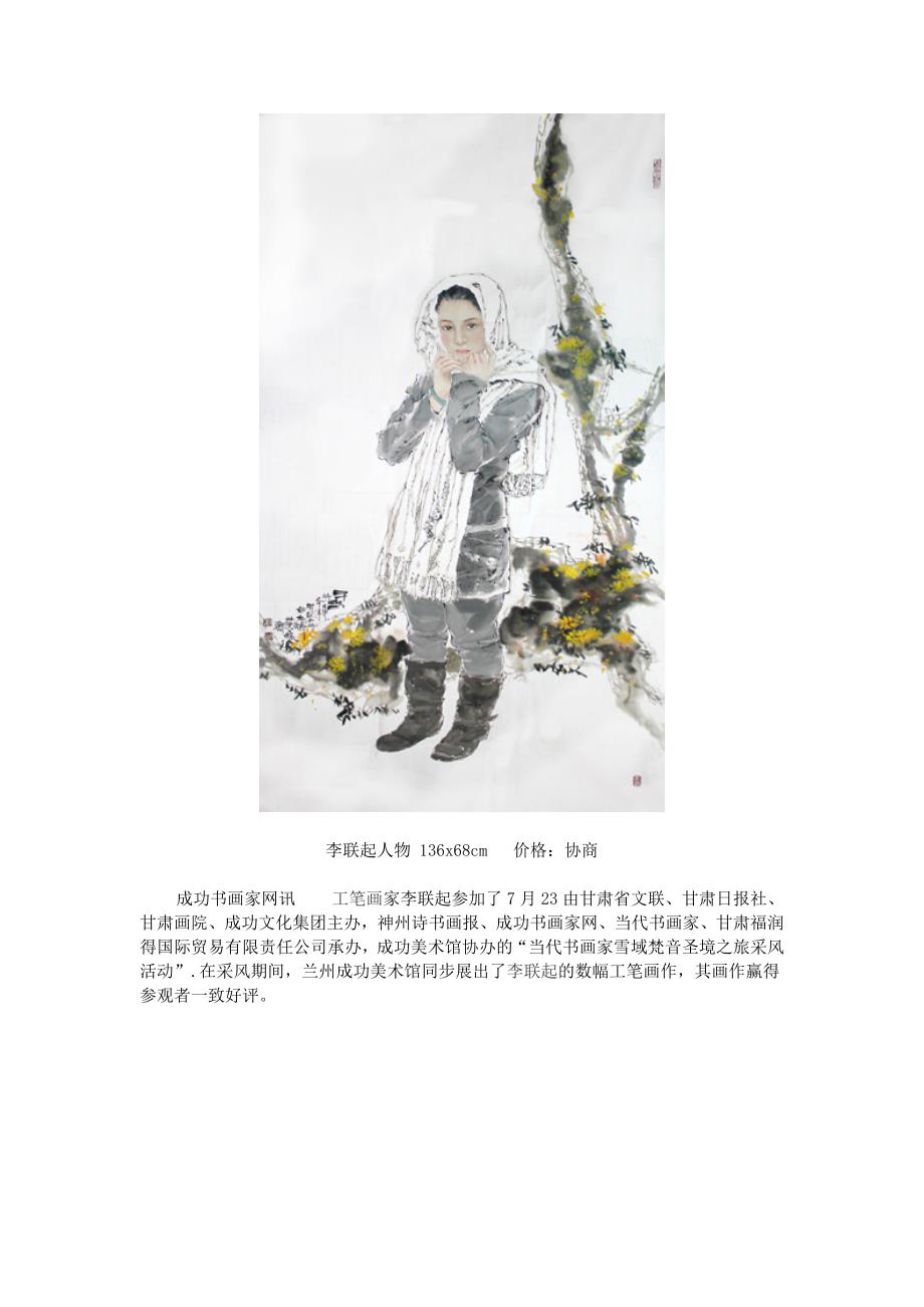 李联起人物 136x68cm 价格:协商成功书画家网讯 工笔画家李联起参加了 7月 23由甘肃省文联、甘肃日报社、甘肃画院、成功文化集团主办,神州诗书画报、成功书画家网、当代书画家、甘肃福润得国际贸易有限责任公司承办,成功美术馆协办的“当代书画家雪域梵音圣境之旅采风活动”.在采风期间,兰州成功美术馆同步展出了李联起的数幅工笔画作,其画作赢得参观者一致好评李联起人物 136cmx68cm 价格:协商李联起的工笔作品用笔细腻柔和,构图简洁大方、设色清淡,以灰色调为主,对光影有着敏锐的感知力,通过对光影层次的把握在画面中展现出满而不塞的视觉效应,给观者营造出那份淡然优雅的情致和 “云高风清”的感觉近些年其画作以其特有的艺术语言形式引起了越来越多的关注李联起,男,出生于中国绘画之乡 -巨野,自幼酷爱绘画,多年来一直在中国画上面学习、探索,先后就读于中国工笔画院花鸟创作高研班、林凡创作研修班现为山东省美术家协会会员、职业画家记者/汪利利 校对/张琴琴)。
