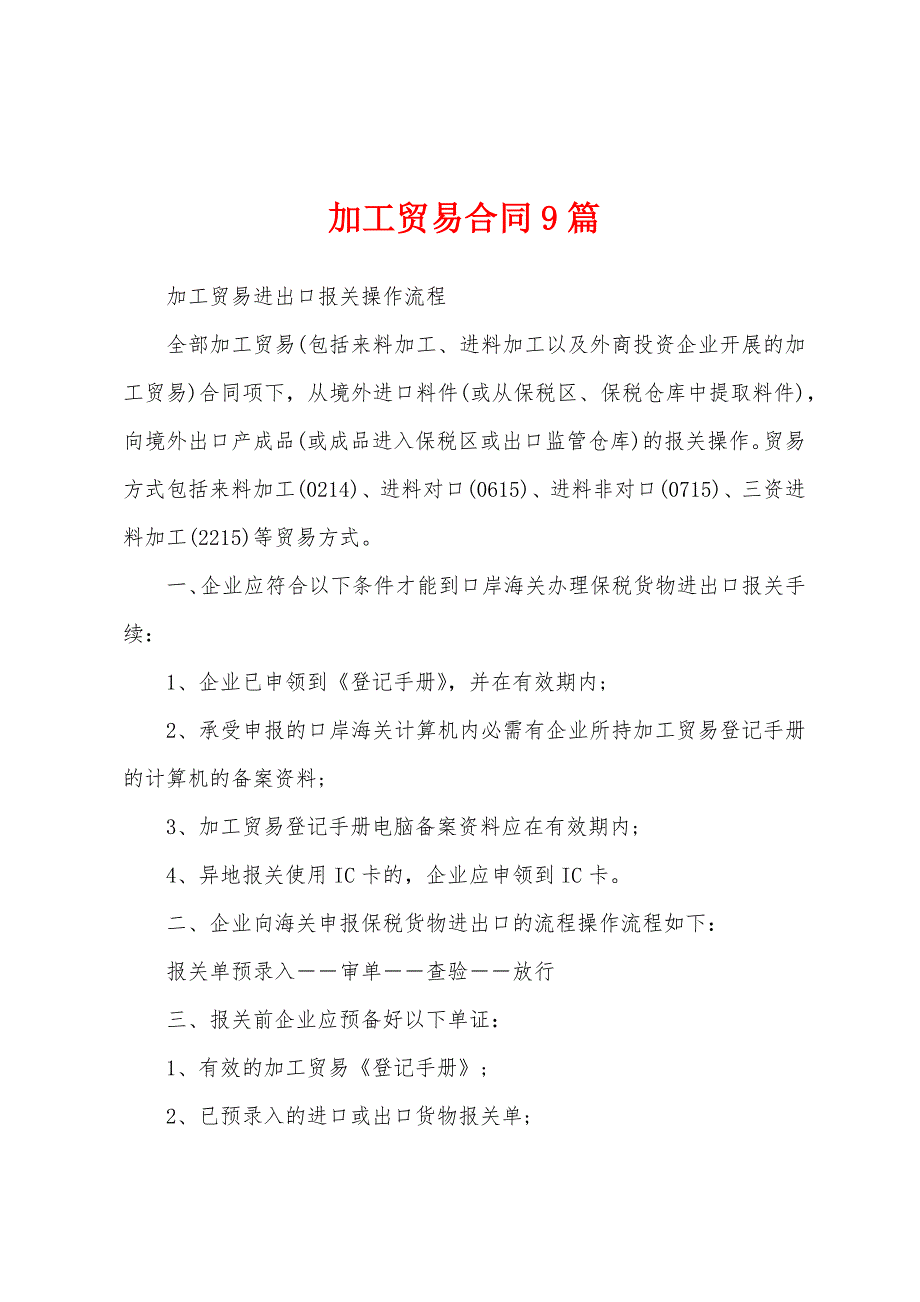 加工贸易合同9篇 加工贸易进出口报关操作流程 全部加工贸易(包括来料加工、进料加工以及外商投资企业开展的加工贸易)合同项下,从境外进口料件(或从保税区、保税仓库中提取料件),向境外出口产成品(或成品进入保税区或出口监管仓库)的报关操作贸易方式包括来料加工(0214)、进料对口(0615)、进料非对口(0715)、三资进料加工(2215)等贸易方式 一、企业应符合以下条件才能到口岸海关办理保税货物进出口报关手续: 1、企业已申领到《登记手册》,并在有效期内; 2、承受申报的口岸海关计算机内必需有企业所持加工贸易登记手册的计算机的备案资料; 3、加工贸易登记手册电脑备案资料应在有效期内; 4、异地报关使用IC卡的,企业应申领到IC卡 二、企业向海关申报保税货物进出口的流程操作流程如下: 报关单预录入――审单――查验――放行 三、报关前企业应预备好以下单证: 1、有效的加工贸易《登记手册》; 2、已预录入的进口或出口货物报关单; 3、海关要求的其他有关单证。