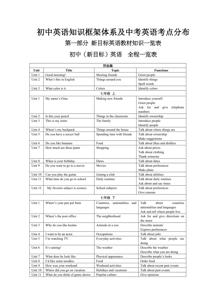 初中英语知识框架体系及中考英语考点分布第一部分 新目标英语教材知识一览表初中(新目标)英语 全程一览表预备篇UnitTitleTopicFunctionsUnit 1Good morning!Meeting friendsGreet peopleUnit 2What’s this in EnglishThings around youIdentify thingsSpell wordsUnit 3What color is itColors Identify colors七年级 上Unit 1My name’s Gina.Making new friendsIntroduce yourselfGreet peopleAsk for and give telephone numbersUnit 2Is this your pencilThings in the classroomIdentify ownershipUnit 3This is my sister.The family Introduce peopleIdentify peopleUnit 4Where’s my backpackThings around the houseTalk about where things areUnit 5Do you have a soccer ballSpending time with friendsTalk about ownershipMake suggestionsUnit 6Do you like bananasFood Talk about likes and dislikesUnit 7How much are these pantsShopping Ask about pricesTalk about clothingThank someoneUnit 8When is your birthdayDates Talk about datesUnit 9Do you want to go to a movieMovies Talk about preferencesMake plansUnit 10Can you play the guitarJoining a clubTalk about abilitiesUnit 11What time do you go to schoolDaily routines Talk about daily routines Ask about and say timesUnit 12 My favorite subject is science.School subjectsTalk about preferences Give reasons七年级 下Unit 1Where’s your pen pal fromCountries, nationalities and languagesTalk about countries nationalities and languagesAsk and tell where people liveUnit 2Where’s the post officeThe neighborhoodAsk for and give directions on the streetUnit 3 Why do you like koalasAnimals in a zooDescribe animals Express preferencesUnit 4I want to be an actor.Occupations Talk about jobs Unit 5 I’m watching TV.Everyday activitiesTalk about what people are doingUnit 6 It’s raining!The weatherDescribe the weatherDescribe what you are doingUnit 7 What does he look likePhysical appearanceDescribe people’s looksUnit 8 I’d like some noodles.Food Order foodUnit 9 How was your weekendWeekend activities Talk about recent past eventsUnit 10 Where did you go on vacationHolidays and vacationsTalk about past eventsUnit 11 What do you think of game showsPopular cultureGive opinions Talk about likes and dislikesUnit 12 Don’t eat in class.Rules Talk about rules八年级上Unit 1 How often do you exerciseFree time activitiesTalk about how often you do things Unit 2 What’s the matterHealth Talk about your health Give adviceUnit 3 What are you doing for vacationVacation plansTalk about future plansUnit 4 How do you get to schoolTransportation Talk about how to get to placesUnit 5 Can you come to my partyInvitation Make,accept and decline invitations Talk about obligationsUnit 6 I’m more outgoing than my sister.Personal traitsTalk about personal traits Compare peopleUnit 7How do you make a banana milk shakeCooking at home Describe a process Follow instructionsUnit 8 How was your school tripSchool trips Talk about events in the pastUnit 9 When was he bornPeople we admireTalk about famous peopleUnit 10 I’m going to be a basketball player.Life goalsTalk about future intentionsUnit 11 Could you please clean your roomChores Make polite requests Ask for permissionUnit 12 What’s the best radio stationYour town Discuss preferences Make comparisons八年级下Unit 1Will people have robotsOpinions Make predictionsUnit 2 What should I doAdvice Talk about problemsGive adviceUnit 3 What were you doing when the UFO arrivedInteresting eventsTalk about past events Talk a storyUnit 4 He said I was hard-working.Telling a storyReport what someone saidUnit5If you go to the party, you’ll have a great time!Decision making Talk about consequencesUnit 6 How long have you been collecting shellsHobbies Talk about how long you have been doing thingsUnit 7Would you mind turning down the musicComplaints Make requests Apologize Unit 8Why don’t you get her a scarfGift givingCompare qualities Give adviceUnit 9Have you ever been to an amusement parkFun places Talk about past experiencesUnit 10It’s a nice day, isn’t itSmall talk Make small talk九年级Unit 1How do you study for a testLearning how to learnTalk about how to studyUnit 2I used to be afraid of the dark.How we have changedTalk about what you used to be likeUnit 3Teenagers should be allowed to choose their own clothes.Rules Talk about what you are allowed to do Agree and disagreeUnit 4What would you doInteresting and embarrassing situationsTalk about imaginary situationsUnit 5It must belong to Carla.A picnicMake inferencesUnit 6I like music that I can dance to.Music Express preferences Unit 7Where would you like to visitvacationsTalk about places you would like to visitUni。