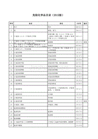 序号 品名 别名 CAS号 备注1 阿片 鸦片 8008-60-42 氨 液氨;氨气 7664-41-73 5-氨基-1,3,3-三甲基环己甲胺异佛尔酮二胺;3,3,5-三甲基-4,6-二氨基-2-烯环己酮;1-氨基-3-氨基甲基-3,5,5-三甲基环己烷2855-13-24 5-氨基-3-苯基-1-[双(N,N-二甲基氨基氧膦基)]-1,2,4-三唑[含量>20%] 威菌磷 1031-47-6 剧毒5 4-[3-氨基-5-(1-甲基胍基)戊酰氨基]-1-[4-氨基-2-氧代-1(2H)-嘧啶基]-1,2,3,4-四脱氧 灰瘟素 2079-00-76 4-氨基-N,N-二甲基苯胺 N,N-二甲基对苯二胺;对氨基-N,N-二甲基苯胺 99-98-97 2-氨基苯酚 邻氨基苯酚 95-55-68 3-氨基苯酚 间氨基苯酚 591-27-59 4-氨基苯酚 对氨基苯酚 123-30-810 3-氨基苯甲腈 间氨基苯甲腈;氰化氨基苯 2237-30-111 2-氨基苯胂酸 邻氨基苯胂酸 2045-00-312 3-氨基苯胂酸 间氨基苯胂酸 2038-72-413 4-氨基苯胂酸 对氨基苯胂酸 98-50-014 4-氨基苯胂酸钠 对氨基苯胂酸钠 127-85-515 2-氨基吡啶 邻氨基吡啶 504-29-016 3-氨基吡啶 间氨基吡啶 462-08-817 4-氨基吡啶 对氨基吡啶;4-氨基氮杂苯;对氨基氮苯;γ-吡啶胺 504-24-518 1-氨基丙烷 正丙胺 107-10-819 2-氨基丙烷 异丙胺 75-31-020 3-氨基丙烯 烯丙胺 107-11-9 剧毒21 4-氨基二苯胺 对氨基二苯胺 101-54-222 氨基胍重碳酸盐 2582-30-123 氨基化钙 氨基钙 23321-74-624 氨基化锂 氨基锂 7782-89-025 氨基磺酸 5329-14-626 5-(氨基甲基)-3-异噁唑醇 3-羟基-5-氨基甲基异噁唑;蝇蕈醇 2763-96-427 氨基甲酸胺 1111-78-0危险化学品目录(2015版)28 (2-氨基甲酰氧乙基)三甲基氯化铵 氯化氨甲酰胆碱;卡巴考 51-83-229 3-氨基喹啉 580-17-630 2-氨基联苯 邻氨基联苯;邻苯基苯胺 90-41-531 4-氨基联苯 对氨基联苯;对苯基苯胺 92-67-132 1-氨基乙醇 乙醛合氨 75-39-833 2-氨基乙醇 乙醇胺;2-羟基乙胺 141-43-534 2-(2-氨基乙氧基)乙醇 929-06-635 氨溶液[含氨>10%] 氨水 1336-21-636 N-氨基乙基哌嗪 1-哌嗪乙胺;N-(2-氨基乙基)哌嗪;2-(1-哌嗪基)乙胺 140-31-837 八氟-2-丁烯 全氟-2-丁烯 360-89-438 八氟丙烷 全氟丙烷 76-19-739 八氟环丁烷 RC318 115-25-340 八氟异丁烯 全氟异丁烯;1,1,3,3,3-五氟-2-(三氟甲基)-1-丙烯 382-21-8 剧毒41 八甲基焦磷酰胺 八甲磷 152-16-9 剧毒42 1,3,4,5,6,7,8,8-八氯-1,3,3a,4,7,7a-六氢-4,7-甲撑异苯并呋喃[含量>1%] 八氯六氢亚甲基苯并呋喃;碳氯灵 297-78-9 剧毒43 1,2,4,5,6,7,8,8-八氯-2,3,3a,4,7,7a-六氢-4,7-亚甲基茚 氯丹 57-74-944 八氯莰烯 毒杀芬 8001-35-245 八溴联苯 27858-07-746 白磷 黄磷 12185-10-347 钡 金属钡 7440-39-348 钡合金49 苯 纯苯 71-43-250 苯-1,3-二磺酰肼[糊状,浓度52%] 4547-70-051 苯胺 氨基苯 62-53-352 苯并呋喃 氧茚;香豆酮;古马隆 271-89-653 1,2-苯二胺 邻苯二胺;1,2-二氨基苯 95-54-554 1,3-苯二胺 间苯二胺;1,3-二氨基苯 108-45-255 1,4-苯二胺 对苯二胺;1,4-二氨基苯;乌尔丝D 106-50-356 1,2-苯二酚 邻苯二酚 120-80-957 1,3-苯二酚 间苯二酚;雷琐酚 108-46-358 1,4-苯二酚 对苯二酚;氢醌 123-31-959 1,3-苯二磺酸溶液 98-48-6苯酚 酚;石炭酸苯酚溶液61 苯酚二磺酸硫酸溶液62 苯酚磺酸 1333-39-763 苯酚钠 苯氧基钠 139-02-664 苯磺酰肼 发泡剂BSH 80-17-165 苯磺酰氯 氯化苯磺酰 1998/9/966 4-苯基-1-丁烯 768-56-967 N-苯基-2-萘胺 防老剂D 135-88-668 2-苯基丙烯 异丙烯基苯;α-甲基苯乙烯 98-83-969 2-苯基苯酚 邻苯基苯酚 90-43-770 苯基二氯硅烷 二氯苯基硅烷 1631-84-171 苯基硫醇 苯硫酚;巯基苯;硫代苯酚 108-98-5 剧毒72 苯基氢氧化汞 氢氧化苯汞 100-57-273 苯基三氯硅烷 苯代三氯硅烷 98-13-574 苯基溴化镁[浸在乙醚中的] 100-58-375 苯基氧氯化膦 苯磷酰二氯 824-72-676 N-苯基乙酰胺 乙酰苯胺;退热冰 103-84-477 N-苯甲基-N-(3,4-二氯基本)-DL-丙氨酸乙酯 新燕灵 22212-55-178 苯甲腈 氰化苯;苯基氰;氰基苯;苄腈 100-47-079 苯甲醚 茴香醚;甲氧基苯 100-66-380 苯甲酸汞 安息香酸汞 583-15-381 苯甲酸甲酯 尼哦油 93-58-382 苯甲酰氯 氯化苯甲酰 98-88-483 苯甲氧基磺酰氯84 苯肼 苯基联胺 100-63-085 苯胩化二氯 苯胩化氯;二氯化苯胩 622-44-686 苯醌 106-51-487 苯硫代二氯化膦 苯硫代磷酰二氯;硫代二氯化膦苯 3497-00-588 苯胂化二氯 二氯化苯胂;二氯苯胂 696-28-6 剧毒89 苯胂酸 1998/5/590 苯四甲酸酐 均苯四甲酸酐 89-32-791 苯乙醇腈 苯甲氰醇;扁桃腈 532-28-560 108-95-292 N-(苯乙基-4-哌啶基)丙酰胺柠檬酸盐 枸橼酸芬太尼 990-73-893 2-苯乙基异氰酸酯 1943-82-494 苯乙腈 氰化苄;苄基氰 140-29-495 苯乙炔 乙炔苯 536-74-396 苯乙烯[稳定的] 乙烯苯 100-42-597 苯乙酰氯 103-80-098 吡啶 氮杂苯 110-86-199 1-(3-吡啶甲基)-3-(4-硝基苯基)脲 1-(4-硝基苯基)-3-(3-吡啶基甲基)脲;灭鼠优 53558-25-1 剧毒100 吡咯 一氮二烯五环;氮杂茂 109-97-7101 2-吡咯酮 616-45-5102 4-[苄基(乙基)氨基]-3-乙氧基苯重氮氯化锌盐103 N-苄基-N-乙基苯胺 N-乙基-N-苄基苯胺;苄乙基苯胺 92-59-1104 2-苄基吡啶 2-苯甲基吡啶 101-82-6105 4-苄基吡啶 4-苯甲基吡啶 2116-65-6106 苄硫醇 α-甲苯硫醇 100-53-8107 变性乙醇 变性酒精108 (1R,2R,4R)-冰片-2-硫氰基醋酸酯 敌稻瘟 115-31-1109 丙胺氟磷 N,N'-氟磷酰二异丙胺;双(二异丙氨基)磷酰氟 371-86-8110 1-丙醇 正丙醇 71-23-8111 2-丙醇 异丙醇 67-63-0112 1,2-丙二胺 1,2-二氨基丙烷;丙邻二胺 78-90-0113 1,3-丙二胺 1,3-二氨基丙烷 109-76-2114 丙二醇乙醚 1-乙氧基-2-丙醇 1569-02-4115 丙二腈 二氰甲烷;氰化亚甲基;缩苹果腈 109-77-3116 丙二酸铊 丙二酸亚铊 2757-18-8117 丙二烯[稳定的] 463-49-0118 丙二酰氯 缩苹果酰氯 1663-67-8119 丙基三氯硅烷 141-57-1120 丙基胂酸 丙胂酸 107-34-6121 丙腈 乙基氰 107-12-0 剧毒122 丙醛 123-38-6123 2-丙炔-1-醇 丙炔醇