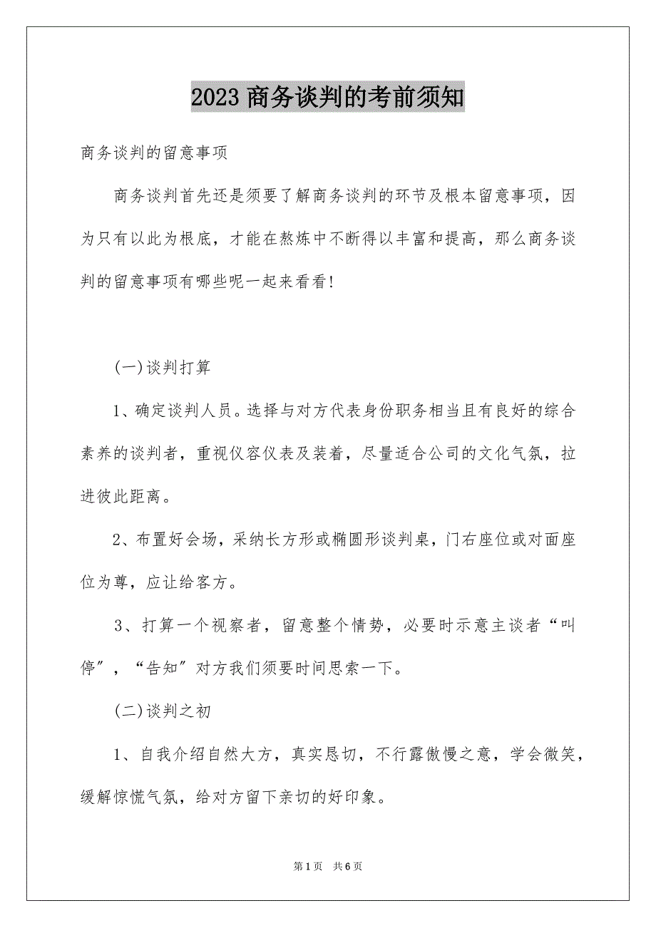2023商务谈判的考前须知商务谈判的留意事项 商务谈判首先还是须要了解商务谈判的环节及根本留意事项,因为只有以此为根底,才能在熬炼中不断得以丰富和提高,那么商务谈判的留意事项有哪些呢一起来看看! (一)谈判打算 1、确定谈判人员选择与对方代表身份职务相当且有良好的综合素养的谈判者,重视仪容仪表及装着,尽量适合公司的文化气氛,拉进彼此距离 2、布置好会场,采纳长方形或椭圆形谈判桌,门右座位或对面座位为尊,应让给客方 3、打算一个视察者,留意整个情势,必要时示意主谈者“叫停〞,“告知〞对方我们须要时间思索一下 (二)谈判之初 1、自我介绍自然大方,真实恳切,不行露傲慢之意,学会微笑,缓解惊慌气氛,给对方留下亲切的好印象 2、介绍者给被介绍者介绍之前,肯定要征求被介绍双方看法以免唐突介绍时,介绍喧闹和被介绍人都以示敬重;介绍完毕后,被介绍双方应微笑点头示意或握手致意,必要时可做进一步自我介绍 3、初次见面或不是非常熟悉的挚友经介绍而相识时少不得在寒喧过后接着进行一些话题,在这种场合谈话的内容就必需加以留意,尽量避开一些只有少数人士有爱好的主题,避谈政治、宗教等可能人人立场不同的话题,有些人虽基于礼貌并不会当场与你争辩,但在心中肯定非常不舒适,可能你无意中得罪了人而不自知,这自然也失去了社交的意义了。