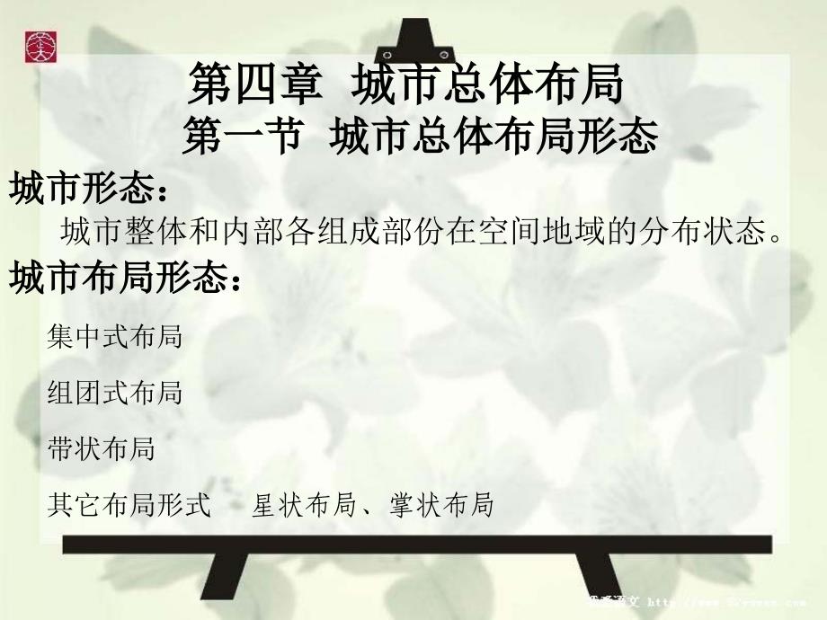 第四节第四节 城市总体规划城市总体规划1.概念:是研究城市各项用地之间的内在联系,概念:是研究城市各项用地之间的内在联系,结合考虑城市化的进程、城市及其相关的城结合考虑城市化的进程、城市及其相关的城市网络、城镇体系在不同时间和空间开展中市网络、城镇体系在不同时间和空间开展中的动态关系的动态关系2.核心:在分析城市用地和建设条件的根底上,核心:在分析城市用地和建设条件的根底上,将城市各组成局部按其不同功能要求、不同将城市各组成局部按其不同功能要求、不同开展序列,有机地组合起来,使城市有一个开展序列,有机地组合起来,使城市有一个科学、合理的总体布局科学、合理的总体布局 3.任务:制定城市经济和社会开展目标,确定城市开展性质、任务:制定城市经济和社会开展目标,确定城市开展性质、规模和建设标准,安排城市用地的功能分区和各项建设的总规模和建设标准,安排城市用地的功能分区和各项建设的总体布局,布置城市道路交通运输系统,选定规划定额指标,体布局,布置城市道路交通运输系统,选定规划定额指标,制定规划实施步骤和措施最终使城市各项功能活动相互协制定规划实施步骤和措施最终使城市各项功能活动相互协调开展。