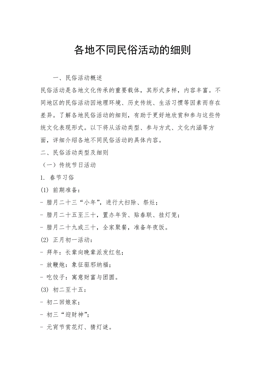 各地不同民俗活动的细则一、民俗活动概述民俗活动是各地文化传承的重要载体,其形式多样,内容丰富不同地区的民俗活动因地理环境、历史传统、生活习惯等因素而存在差异了解各地民俗活动的细则,有助于更好地欣赏和参与这些传统文化表现形式以下将从活动类型、参与方式、文化内涵等方面,详细介绍各地不同民俗活动的具体内容二、民俗活动类型及细则(一)传统节日活动1. 春节习俗(1) 前期准备:- 腊月二十三“小年”,进行大扫除、祭灶;- 腊月二十五至三十,置办年货、贴春联、挂灯笼;- 腊月二十九或三十,全家聚餐,准备年夜饭2) 正月初一活动:- 拜年:长辈向晚辈派发红包;- 放鞭炮:象征驱邪纳福;- 吃饺子:寓意财富与团圆3) 初二至十五:- 初二回娘家;- 初三“迎财神”;- 元宵节赏花灯、猜灯谜2. 中秋节习俗(1) 前期准备:- 提前购买月饼、柚子等食品;- 制作灯笼或购买现成灯笼2) 当日活动:- 家人团聚,共进晚餐;- 举杯赏月,食用月饼;- 舞动灯笼,开展灯谜活动二)地方特色活动1. 地方戏曲表演(1) 活动流程:- 提前搭建戏台;- 演员化妆、排练;- 正式演出,观众席分等级就坐2) 观赏要点:- 注意戏曲的唱腔、身段、脸谱等特色;- 了解不同剧种的经典剧目。