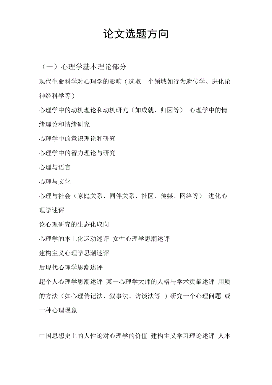 论文选题方向(一)心理学基本理论部分现代生命科学对心理学的影响(选取一个领域如行为遗传学、进化论 神经科学等)心理学中的动机理论和动机研究(如成就、归因等) 心理学中的情绪理论和情绪研究心理学中的意识理论和研究心理学中的智力理论与研究心理与语言心理与文化心理与社会(家庭关系、同伴关系、社区、传媒、网络等) 进化心理学述评论心理研究的生态化取向心理学的本土化运动述评 女性心理学思潮述评建构主义心理学思潮述评后现代心理学思潮述评超个人心理学思潮述评 某一心理学大师的人格与学术贡献述评 用质的方法(如心理传记法、叙事法、访谈法等 )研究一个心理问题 或一种心理现象中国思想史上的人性论对心理学的价值 建构主义学习理论述评 人本主义心理学思潮的渊源与背景 论自我效能感及其培养 大学生成就动机的归因对学业成绩的影响 大学生个性特征与智力水平的相关研究 创造性思维与学业成就的相关研究 荣格的人本主义心理学思想述评 家庭教养方式对中学生创造性人格的影响研究 教师期望对中学生学业成绩的影响 浅论内隐学习与外显学习的关系(二)人格心理学部分 精神分析学派的人格理论及有关主题的心理学研究 行为主义的人格理论及有关主题的心理学研究 人本主义人格理论及有关主题的心理学研究 人格的特质理论及有关主题的心理学研究 生物学取向的人格理论及有关主题的心理学研究 认知取向的人格理论及有关主题的心理学研究 自我概念的心理学研究 自尊的心理学研究 自我效能的心理学研究 自我同一性的心理学研究潜意识的心理学研究攻击性的心理学研究性别差异的心理学研究国民性(中国人)的心理学研究幸福感(爱情、友谊、亲密、孤独、创造、智慧、天才、嫉妒、焦虑、 冲突、恐惧、抑郁、无助、乐观主义、完美主义、利他主义、亲和动 机、权力动机、个人奋斗、生活目标、当前关注、A型性格、内外控、 感觉寻求等)主题及其某些主题之间的关系(如完美主义与主观幸福 感的关系)的研究积极心理学述评人格中的动机研究取向述评依恋理论对人格研究的影响内隐人格理论述评创造性人格研究(小学生、中学生、大学生)网络成瘾行为与人格特质的关系研究(三)实验心理学与心理学研究方法部分视听觉模式识别的计算理论言语理解的机制机器翻译的理论及应用注意选择性的神经机制 空间注意和客体注意的机制内隐记忆研究语义记忆研究 记忆的组织 工作记忆与问题解决的重要 问题解决的计算机模拟 专家系统的开发内隐社会认知新范式一 IAT道德认知的理论及实验研究 幸福认知的理论实验研究 心理学数量化方法的优缺点评估 心理学研究方法的比较研究 心理实验的逻辑在心理学方法中的作用 多元统计分析与心理学研究 论心理研究的生态化取向 论心理学测量工具的正确使用 教育与心理实验研究的科学化评估 人格测验科学性之争 大五人格特质的界定与争论 认知心理研究的方法论问题 知觉恒常性发展的实验研究 影响错觉量的因素的研究 背景色对文字识别的影响 动作协调性的检测方法研究 颜色喜好研究 汽车驾驶员的心理素质评估方案研究 职业价值现调查 职业决策心理机制研究 职业心理素质的诊断与评估 职业培训中心理学问题 职业指导课程设计的初步构想 中学生的意志力训练方案 个性与智力对学生学习成绩的影响 中学生职业分流的心态调查 职业兴趣测验的SDS的修订 心理测量工具在心理中的正确使用 心理研究中的现象学与实证主义方法论 认知心理学部分 双语问题的研究 言语识别问题的研究 自转体记忆研究 语言对记忆加工过程的影响 视觉搜索问题的研究 语言和选择性注意关系的研究 语言和人格判断关系的研究 语言和人际交往关系的研究语言和心理咨询和心理治疗关系的研究语言和情绪关系的研究 语言和思维关系的研究 心理表象的研究 概念形成过程的研究 第二语言习得研究(四)发展与教育心理学部分 中学生过度使用及其与学业成绩的关系研究 中学生的亲子关系与其不良社会行为之间的关系研究 中学生追星背后的心理分析幼儿早期智力开发的训练模式 针对自闭症孩子的教育模式探讨 城市老年人与农村老年人主观幸福感的对比分析 大学生性取向偏差的原因分析个体心理理论的毕生发展学业不良中小学生的认知特点分析——基于韦氏儿童智力量表(第4 版)的结果以认知特征为基础,学业不良中小学生的干预方案设计中小学生学业 负担调查中小学生零花钱状况调查 中小学生中“擂肥”现象的调查 大、中、小学生网络行为研究大、中、小学生生活满意感调查 大、中、小学生电子游戏行为的特点研究 大、中、小学生学习动机研究大、中学生价值观调查 大、中学生生活压力事件调查 中小学生对教师的评价研究 中小学生中课外补习班现象调查 大学生寝室交往的人际动力研究当前青年择业倾向调查 城市(或农村)人口生活满意感调查大学生家庭观念研究 大学生亲子关系调查 校园暴力事件调查 家庭暴力事件调查生活价值观的代际比较 论青年身体发育特点与心理发展水平之间的关系 论智力高而成就低的原因 论青年非智力因素对智力发展的作用 开发青年智力为什么要重视非智力因素的培养? 论青年是创造性思维发展的