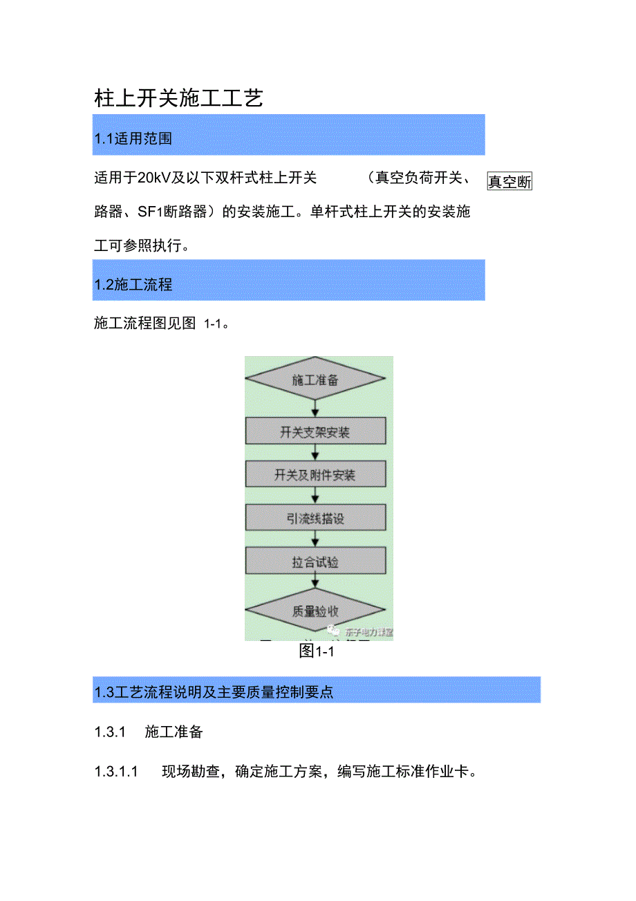 柱上开关施工工艺1.1适用范围真空断适用于20kV及以下双杆式柱上开关 (真空负荷开关、路器、SF1断路器)的安装施工单杆式柱上开关的安装施 工可参照执行1.2施工流程施工流程图见图 1-1图1-11.3工艺流程说明及主要质量控制要点1.3.1 施工准备1.3.1.1 现场勘查,确定施工方案,编写施工标准作业卡131.2 检查杆塔外观、埋深、倾斜是否符合隔离开关安装的要求131.3 接地施工完毕,符合规范要求,接地电阻不应大于设计值1.3.1.4 开关在运输吊装时不允许有强烈震动, 不允许倒置、翻滚,不允许抬、杠(拉)瓷套管1.3.1.5 核对开关、隔离开关及避雷器型号, 外观检查良好,设备完整无损伤,电气试验合格1.3.1.6 所有部件及备件应齐全,无锈蚀或机械损伤,开关绝缘部件不应变形、受潮横担支架镀锌完好、无锈蚀、扭曲等现象,螺栓配套齐全1.3.1.7 合格的施工机具、施工人员到岗到位1.3.2 开关支架安装1.3.2.1 开关支架安装尺寸应符合设计要求,组装尺寸允许偏差应在土 20mm范围内1.3.2.2 螺栓的穿向应统一,连接牢固、可靠,达到规范要求的扭矩;拧紧后,外露丝扣不应小于 2扣,不得长于20mm顺线路方向,双面结构由内向外,单面结构由送电侧穿入或 按统一方向;横线路方向,两侧由内向外,中间由左向右(面 向受电侧)或按统一方向;垂直方向,由下向上。