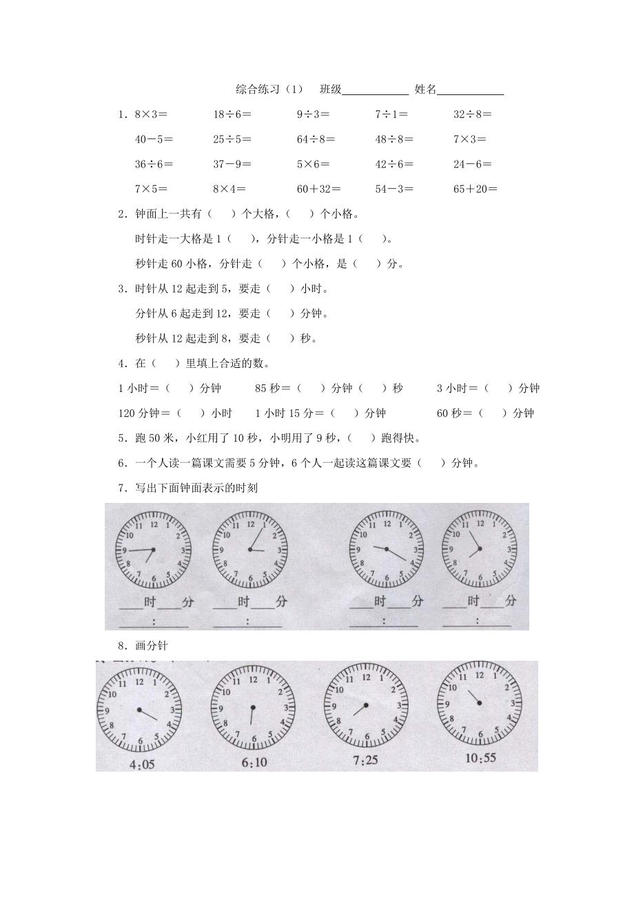 综合练习(1) 班级 姓名 1.8×3= 18÷6= 9÷3= 7÷1= 32÷8=40-5= 25÷5= 64÷8= 48÷8= 7×3=36÷6= 37-9= 5×6= 42÷6= 24-6=7×5= 8×4= 60+32= 54-3= 65+20=2.钟面上一共有( )个大格, ( )个小格时针走一大格是 1( ) ,分针走一小格是 1( ) 秒针走 60 小格,分针走( )个小格,是( )分3.时针从 12 起走到 5,要走( )小时 分针从 6 起走到 12,要走( )分钟秒针从 12 起走到 8,要走( )秒4.在( )里填上合适的数1 小时=( )分钟 85 秒=( )分钟( )秒 3 小时=( )分钟120 分钟=( )小时 1 小时 15 分=( )分钟 60 秒=( )分钟5.跑 50 米,小红用了 10 秒,小明用了 9 秒, ( )跑得快。