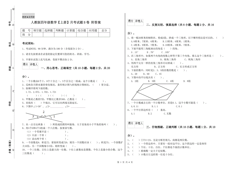 乡镇(街道) 学校 班级 姓名 学号 ………密……….…………封…………………线…………………内……..………………不……………………. 准…………………答…. …………题… 绝密★启用前人教版四年级数学【上册】月考试题B卷 附答案题 号填空题选择题判断题计算题综合题应用题总分得 分考试须知: 1、 考试时间:90分钟,满分为100分(含卷面分2分) 2、 请首先按要求在试卷的指定位置填写您的姓名、班级、学号3、不要在试卷上乱写乱画,卷面不整洁扣2分 一、用心思考,正确填空(共10小题,每题2分,共20分)1、一个小数由6个十,8个十分之一,5个百分之一组成,这个小数是( )2、反映各月降水量的变化情况,条形统计图与折线统计图相比,( )更合适3、按顺序排列下面的数1.72、2.072、1.702、1.721 ( )<( )<( )<( )4、甲数是乙数的7倍,甲数比乙数多360,乙数是( )。