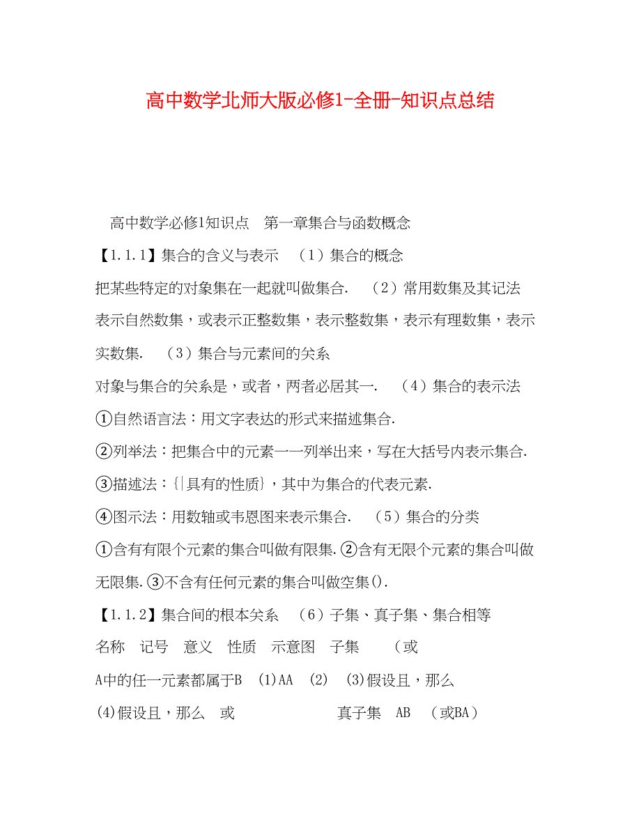 高中数学北师大版必修1-全册-知识点总结 高中数学必修1知识点 第一章集合与函数概念 【1.1.1】集合的含义与表示 (1)集合的概念 把某些特定的对象集在一起就叫做集合. (2)常用数集及其记法 表示自然数集,或表示正整数集,表示整数集,表示有理数集,表示实数集. (3)集合与元素间的关系 对象与集合的关系是,或者,两者必居其一. (4)集合的表示法 ①自然语言法:用文字表达的形式来描述集合. ②列举法:把集合中的元素一一列举出来,写在大括号内表示集合. ③描述法:{|具有的性质},其中为集合的代表元素. ④图示法:用数轴或韦恩图来表示集合. (5)集合的分类 ①含有有限个元素的集合叫做有限集.②含有无限个元素的集合叫做无限集.③不含有任何元素的集合叫做空集(). 【1.1.2】集合间的根本关系 (6)子集、真子集、集合相等 名称 记号 意义 性质 示意图 子集 (或 A中的任一元素都属于B (1)AA (2) (3)假设且,那么 (4)假设且,那么 或 真子集 AB (或BA) ,且B中至少有一元素不属于A (1)(A为非空子集) (2)假设且,那么 集合 相等 A中的任一元素都属于B,B中的任一元素都属于A (1)AB (2)BA (7)集合有个元素,那么它有个子集,它有个真子集,它有个非空子集,它有非空真子集. 【1.1.3】集合的根本运算 (8)交集、并集、补集 名称 记号 意义 性质 示意图 交集 且 (1) (2) (3) ⑷ Α⊆B⟺A∩B=A 并集 或 (1) (2) (3) ⑷A⊆B⟺A∪B=B 补集 ∁uA ⑴ (∁uA)∩A=∅, ⑵ ∁uA∪A=U, ⑶ ∁u∁uA=A, ⑷ ∁uA∩B=∁uA∪∁uB, ⑸ ∁u(A∪B)=(∁uA)∩(∁uB) ⑼ 集合的运算律: 交换律: 结合律: 分配律: 0-1律: 等幂律: 求补律:A∩∁uA=∅ A∪CuA=U ∁uU=∅∁u∅=U 反演律:∁u(A∩B)=(∁uA)∪(∁uB) ∁u(A∪B)=(∁uA)∩(∁uB) 第二章函数 §1函数的概念及其表示 一、映射 1.映射:设A、B是两个集合,如果按照某种对应关系f,对于集合A中的 元素,在集合B中都有 元素和它对应,这样的对应叫做 到 的映射,记作 . 2.象与原象:如果f:A→B是一个A到B的映射,那么和A中的元素a对应的 叫做象, 叫做原象。